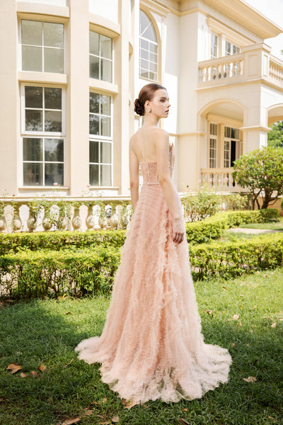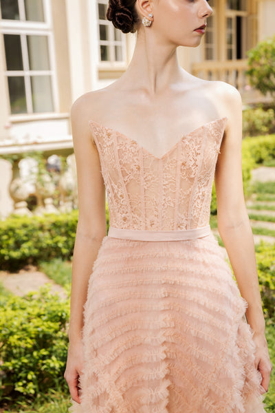 The bodice is crafted from floral lace, structured with internal boning for a secure and elegant fit. Hand-embellished clusters of shimmering pearls and crystals gracefully adorn the lace, adding a subtle yet radiant sparkle. The flowing A-line skirt is accentuated with cascading ruffled tulle waves, creating a rhythmic, sculptural movement with every step.