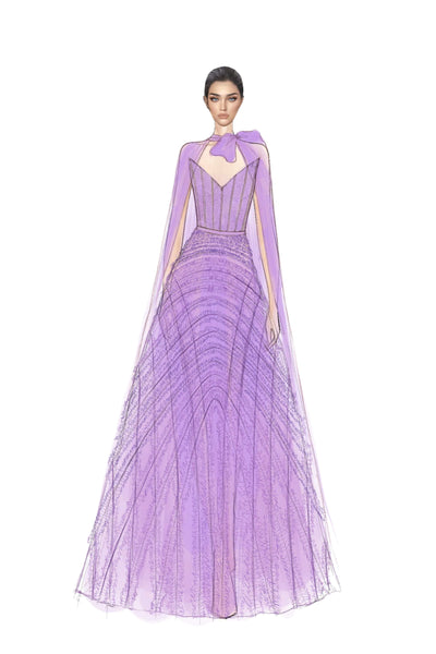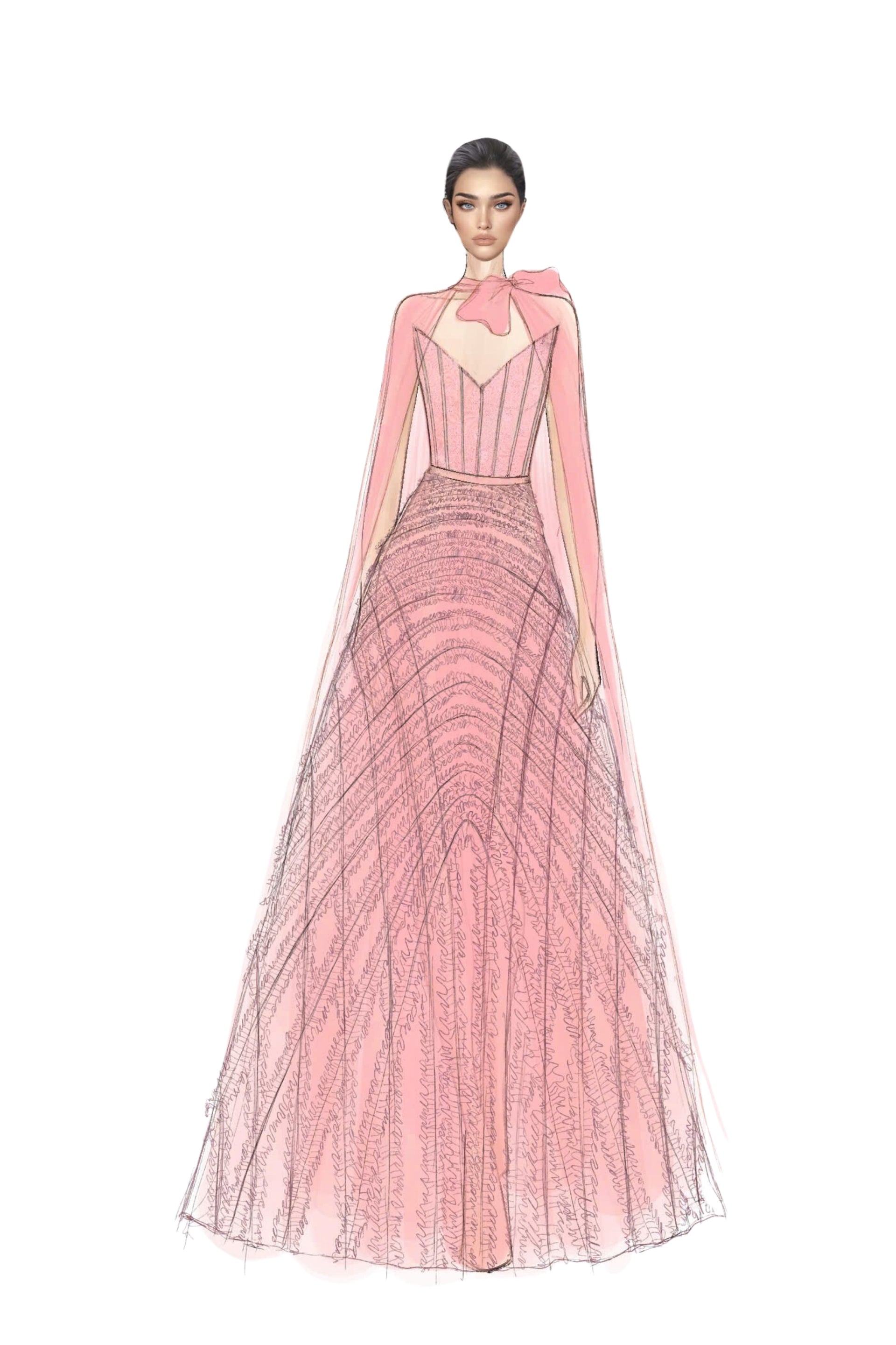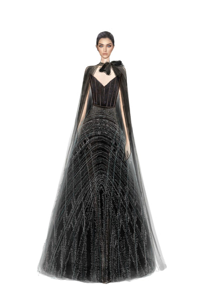 To complete this enchanting look, a sheer silk organza cape drapes effortlessly over the shoulders, fastened with a statement oversized bow at the neckline, enhancing the design’s femininity and charm.