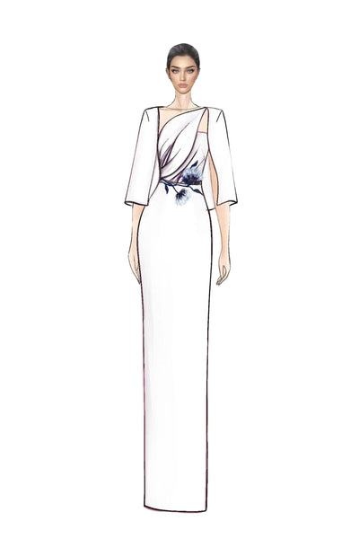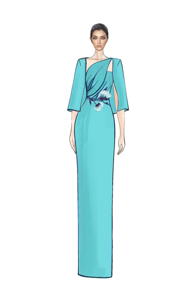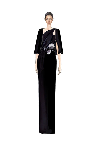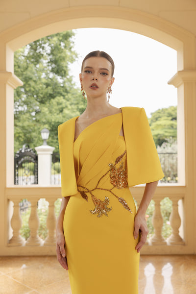 A mesmerizing sleeveless bodycon gown, featuring a delicately pleated bodice that mimics the layered petals of a blooming flower. The structured silhouette is paired with a uniquely designed short cape, elevating its elegance.