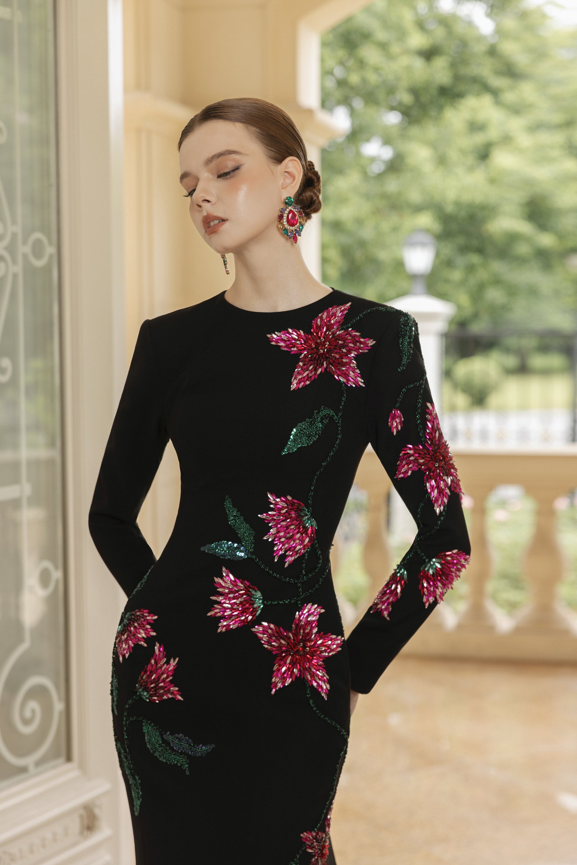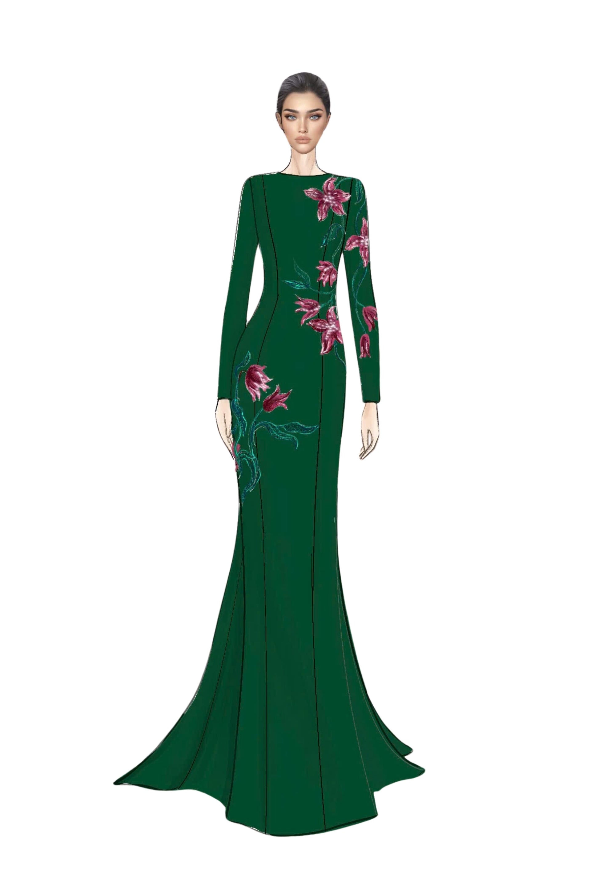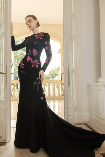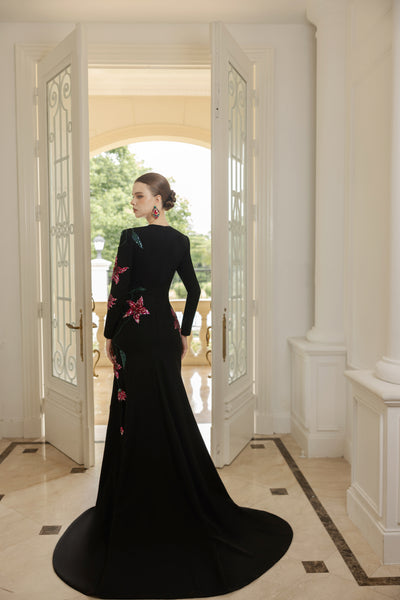 A true showpiece of haute couture craftsmanship, this mermaid gown is designed to celebrate both femininity and artistry. The high neckline, long sleeves, and sculpted silhouette embrace the figure, enhancing elegance while exuding an air of regal sophistication.