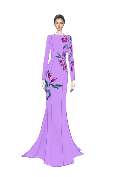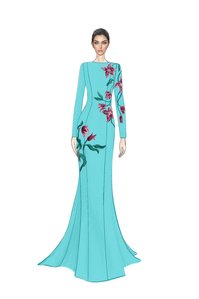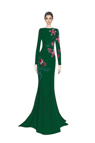 What makes this gown extraordinary is its meticulously hand-embellished floral motif, inspired by the Lily flower in its various stages of bloom—from delicate buds to full blossoms. Each flower is brought to life using marquise diamond crystals, which shimmer like dewdrops, while the stems and leaves are crafted with hand-sewn sequins and beads in varying shades, creating depth and movement. This elaborate composition demands exceptional artisanal skill, making it a true work of art.