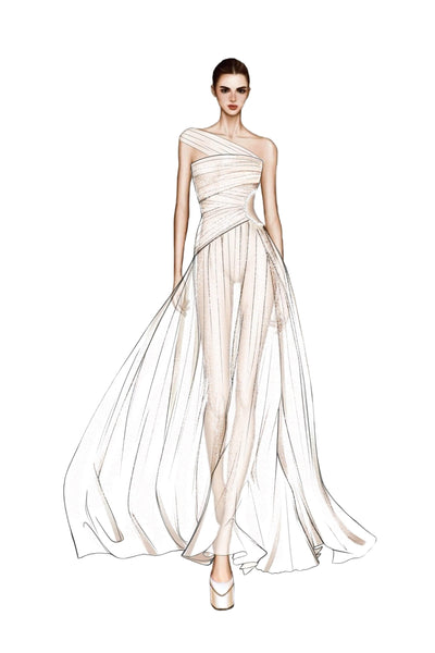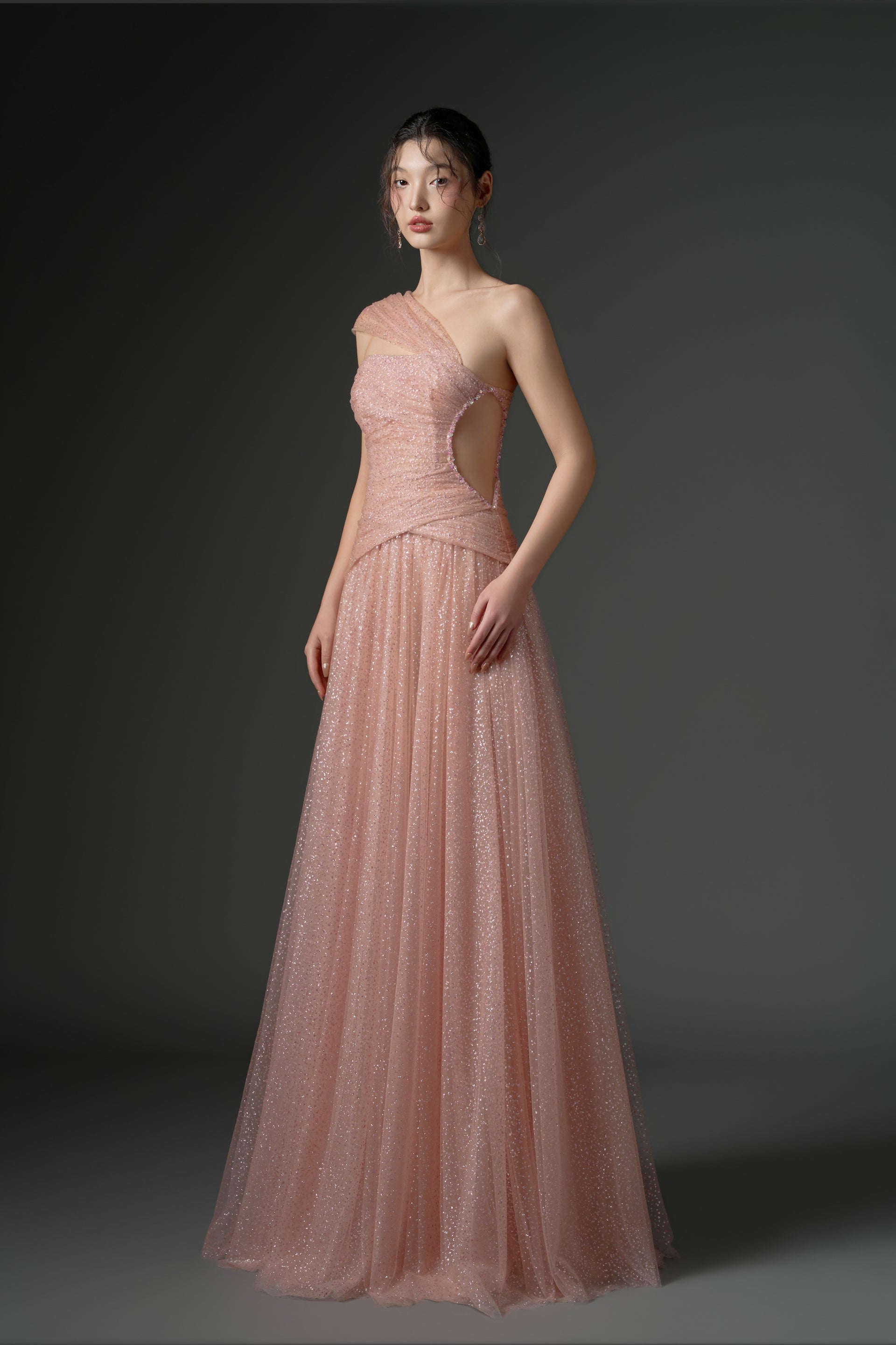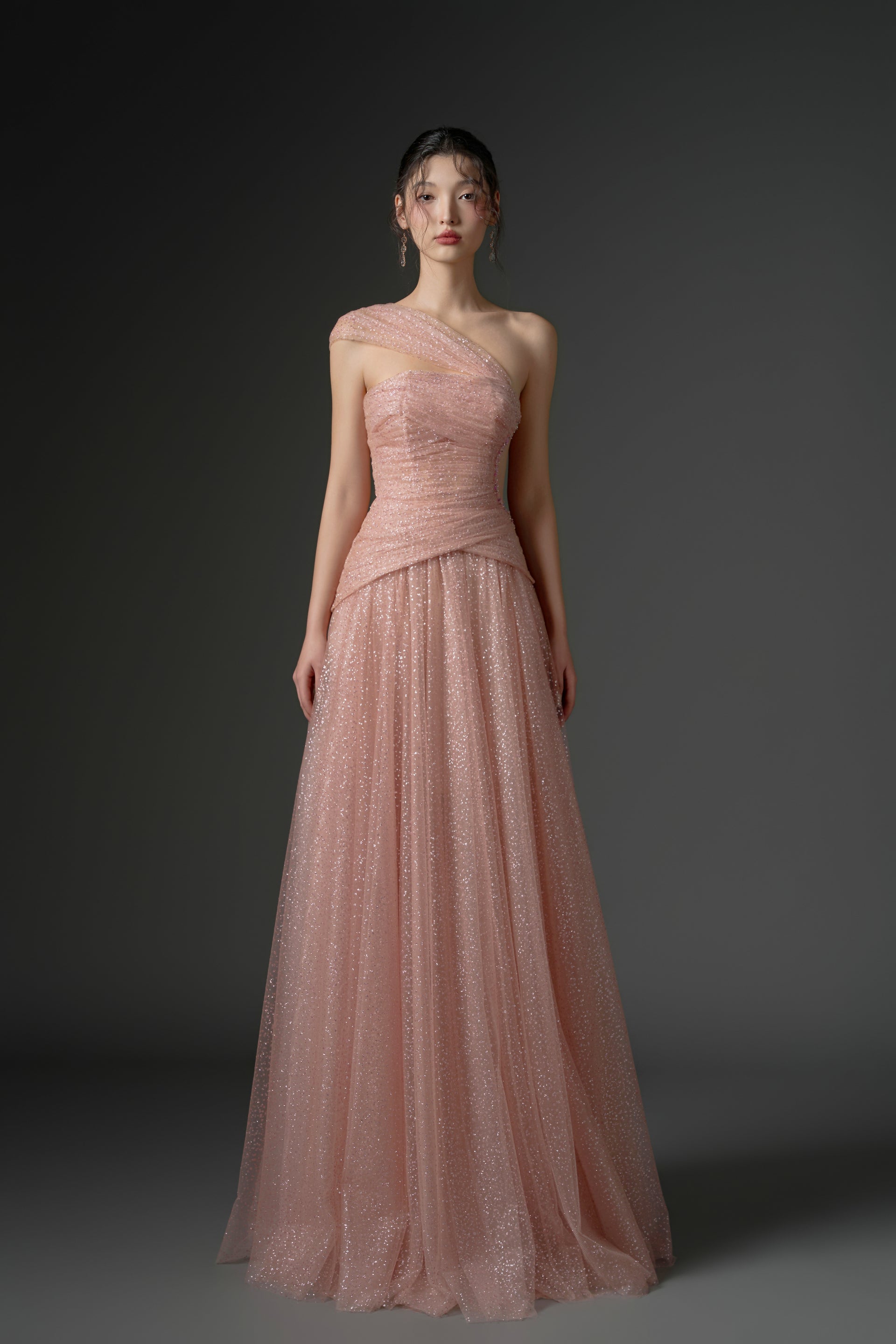 This gown is crafted from shimmering tulle fabric, offering a radiant and luxurious effect. The fitted bodice flows into a softly flared skirt, creating a graceful and feminine silhouette.