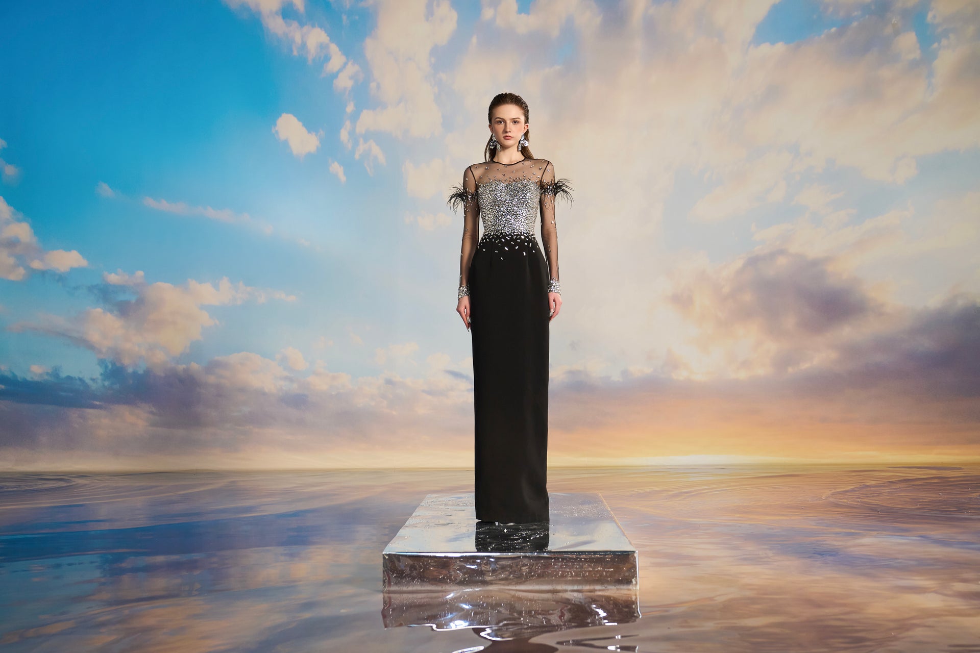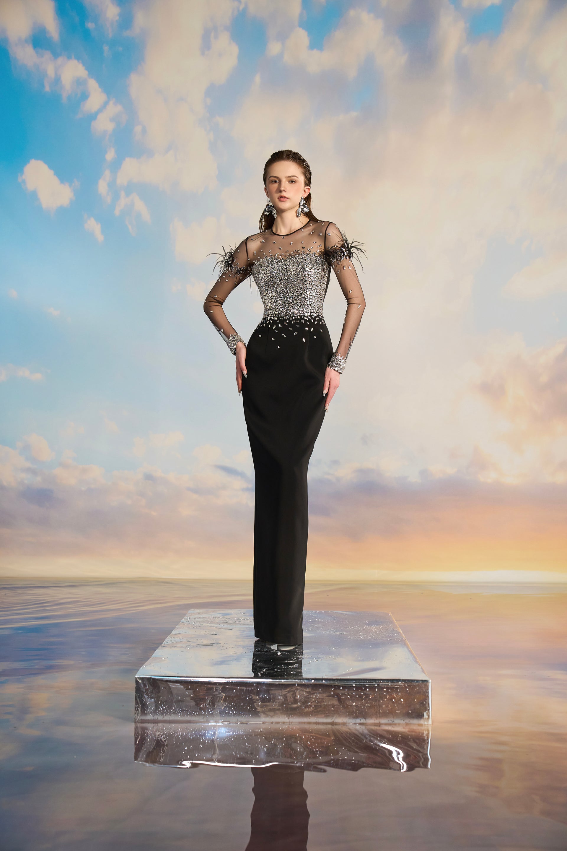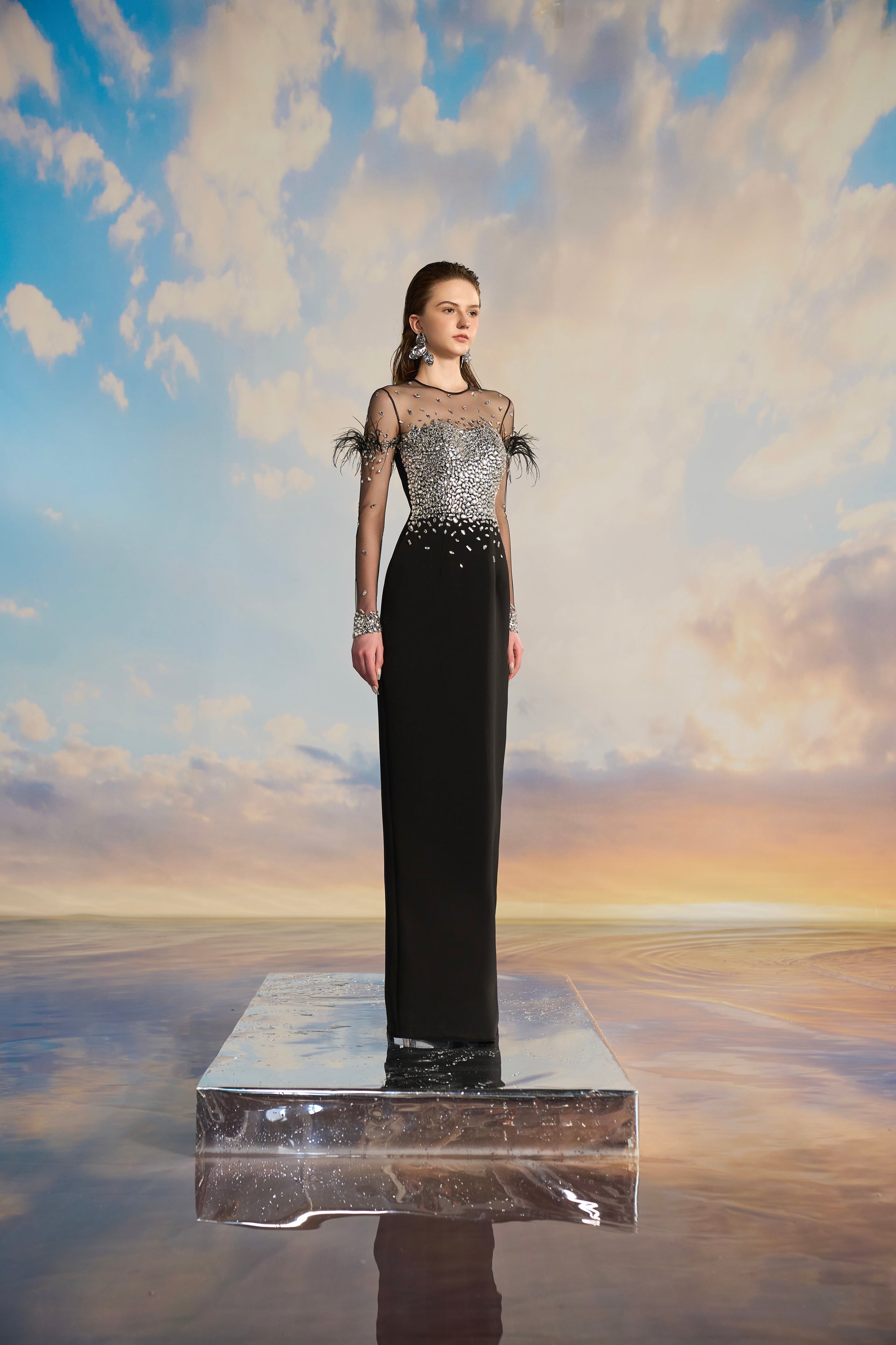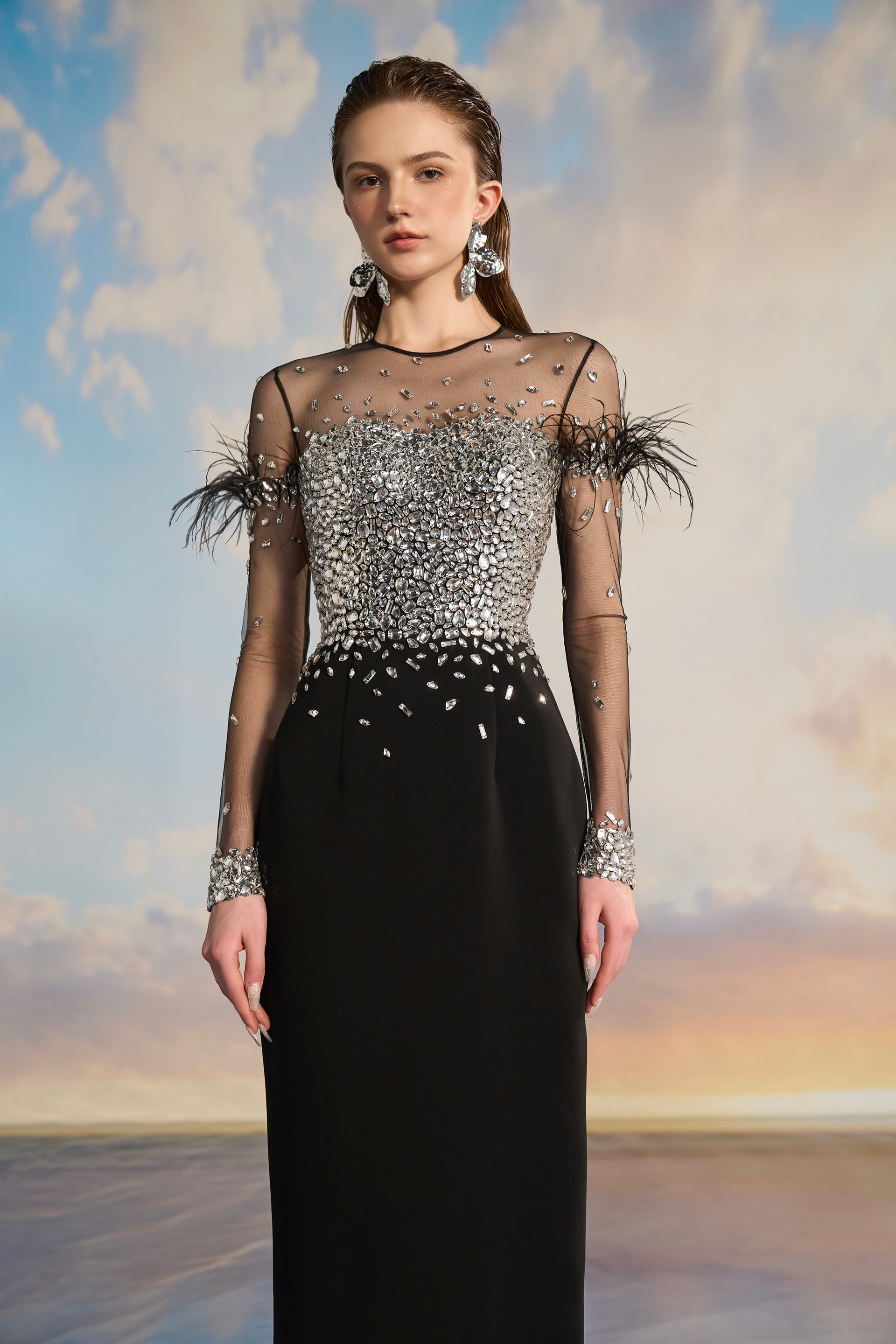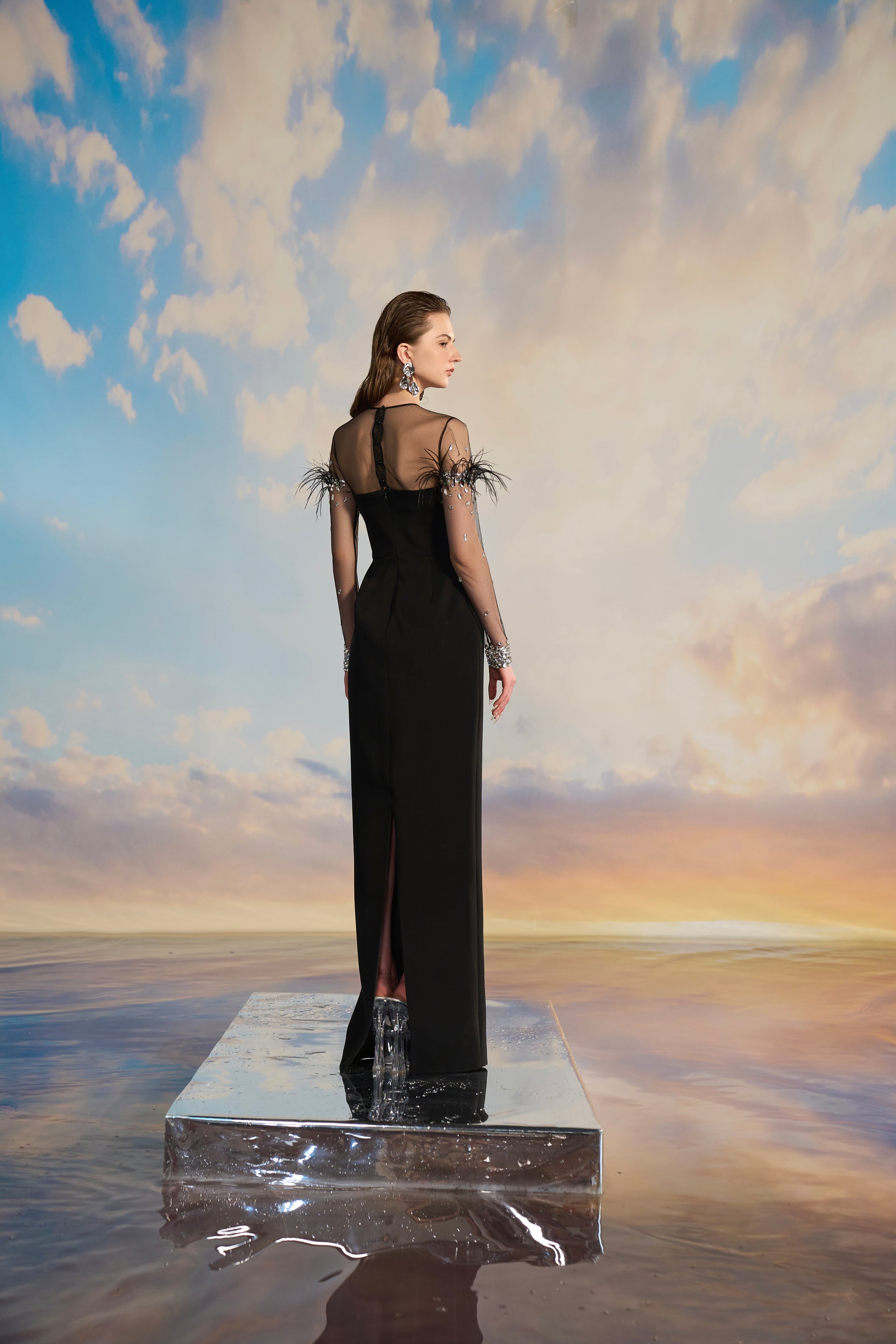 The design showcases a sheer illusion neckline with long transparent sleeves. Intricate handmade feathers on the shoulders and hand-applied crystals along the sleeves add a touch of drama and refinement. The fitted silhouette elegantly accentuates the body’s curves while maintaining a sophisticated allure.