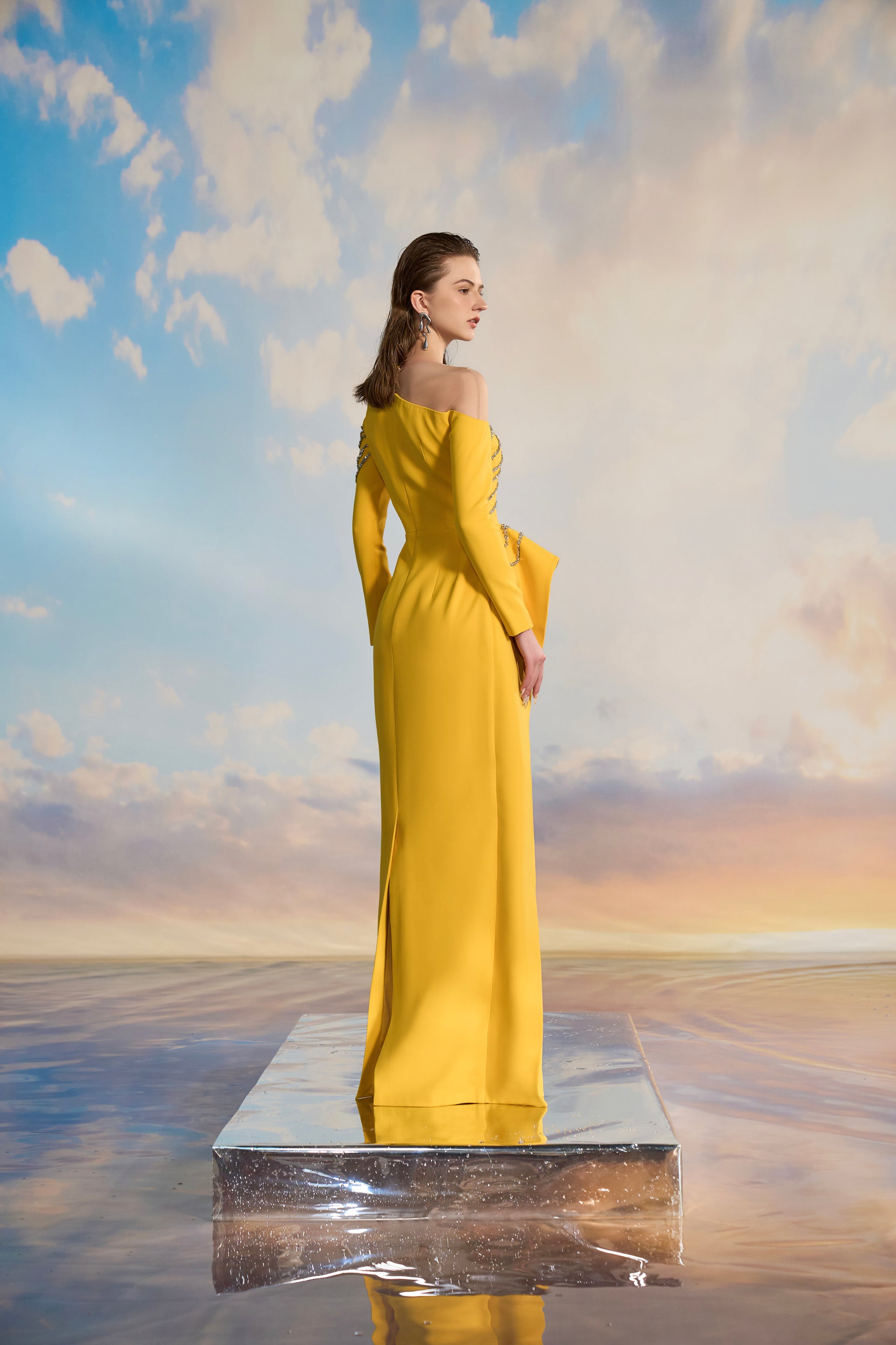 The asymmetrical off-shoulder neckline adds a contemporary allure, while the silhouette hugs the body with refined sophistication.