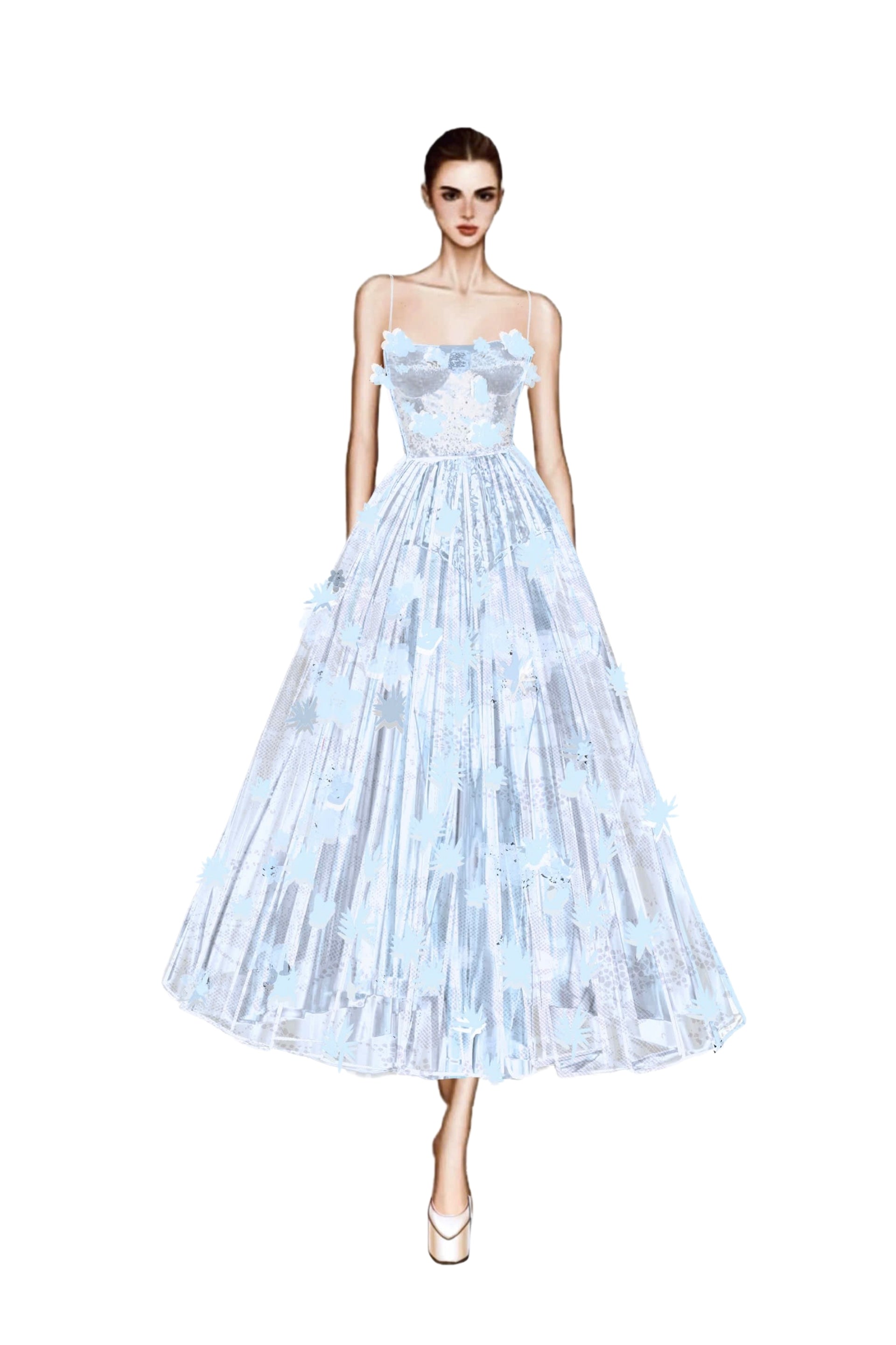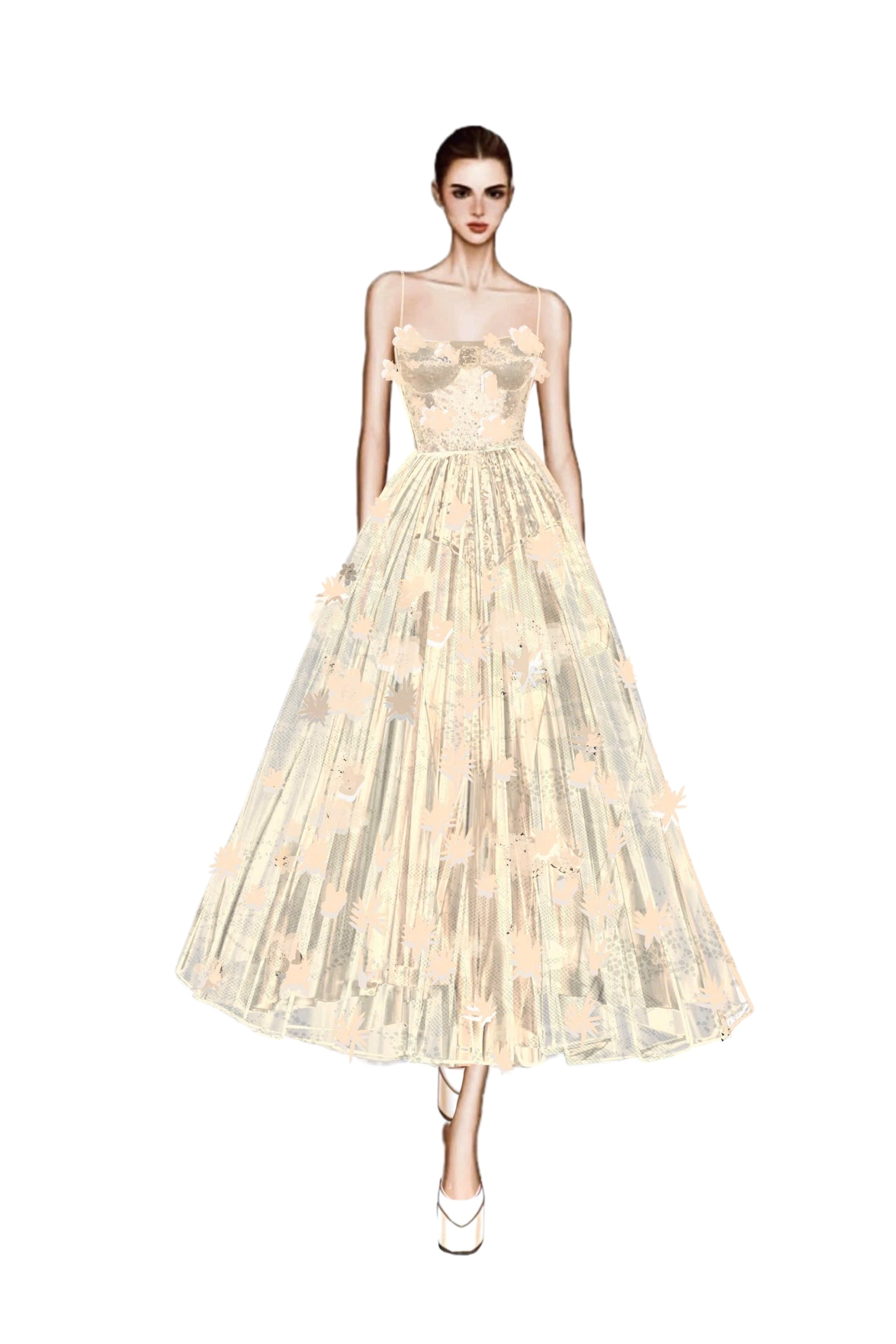 Crafted from premium lace, the gown offers a graceful, airy texture, accentuated by meticulously hand-applied floral embellishments that add a poetic and luxurious touch.