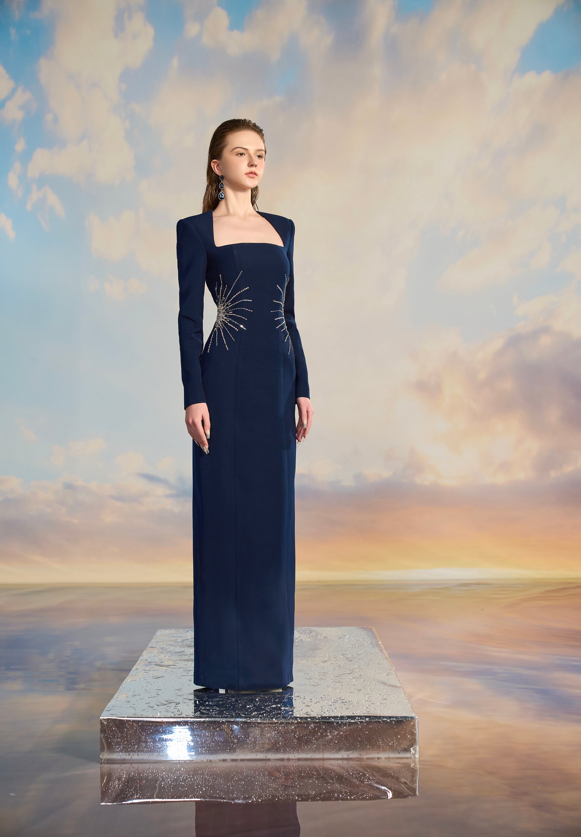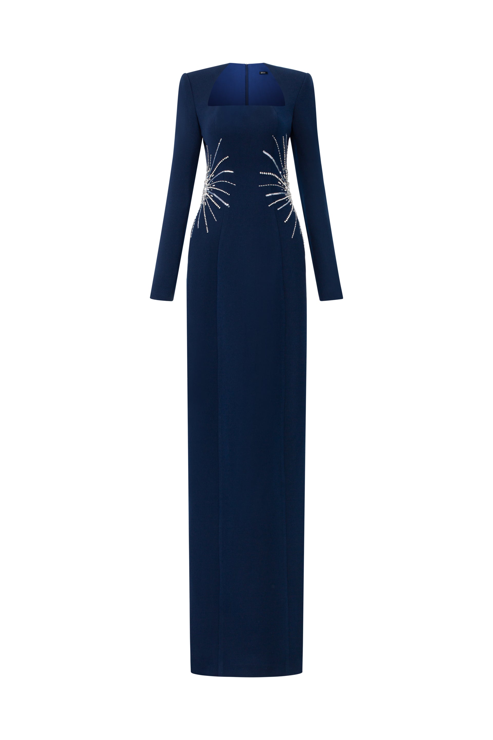 The square neckline and long sleeves exude refined sophistication, while the hand-embellished crystal details at the waist mimic radiant bursts of light—both a statement accent and a flattering highlight to the waistline.