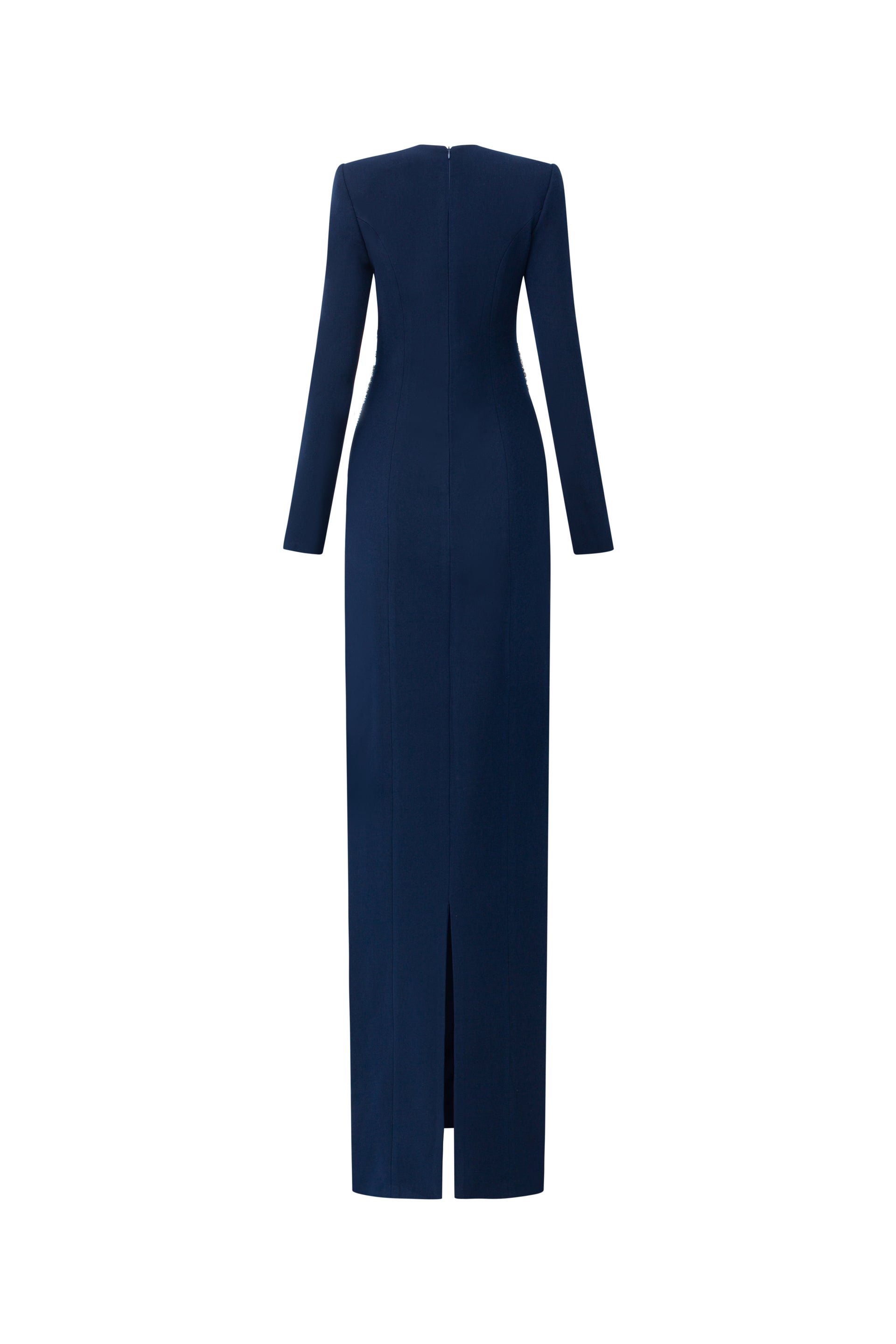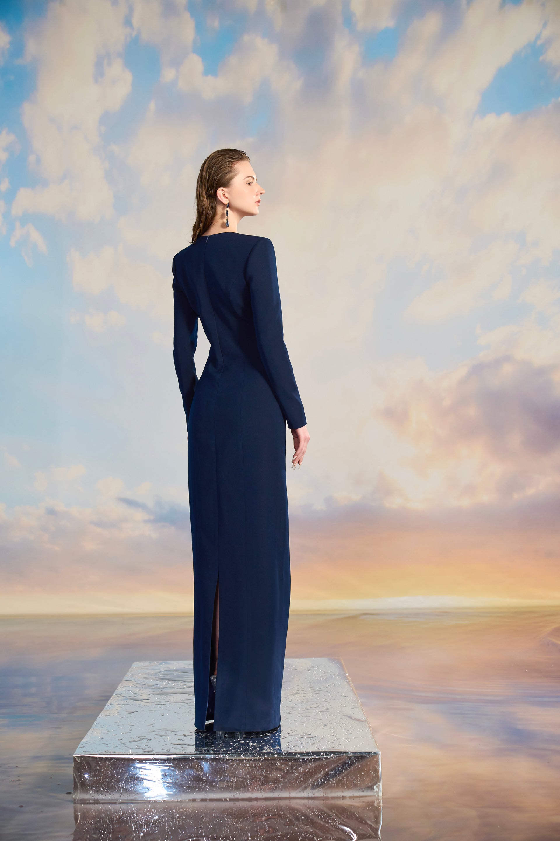 This evening gown is crafted from premium crepe fabric in a sleek, bodycon silhouette that elegantly highlights the wearer’s curves.