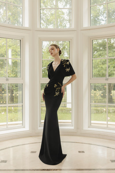 With its classic silhouette and opulent embellishments, this gown is designed for those who seek mystique, luxury, and timeless sophistication.