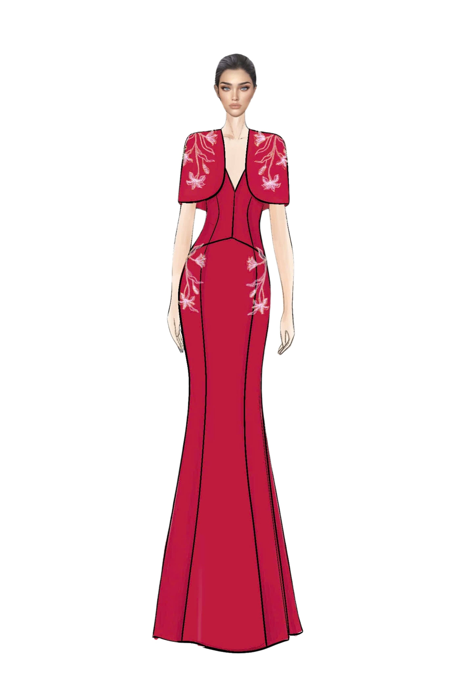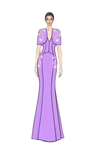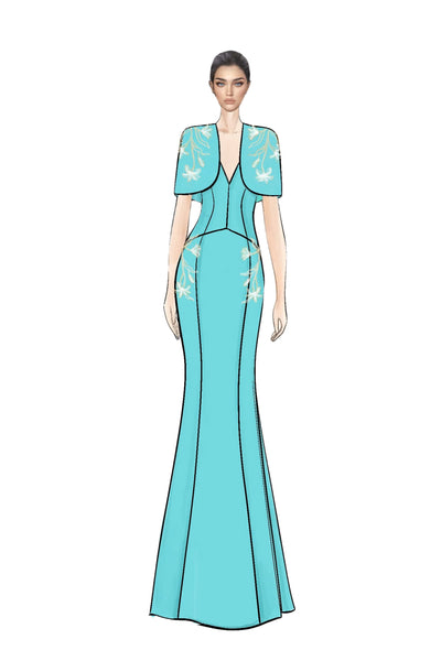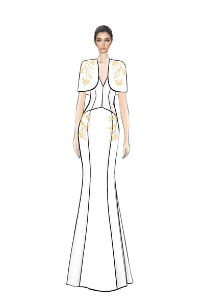 A vision of refined elegance, this set features a sleeveless V-neck mermaid gown complemented by a short cape for an added touch of drama.