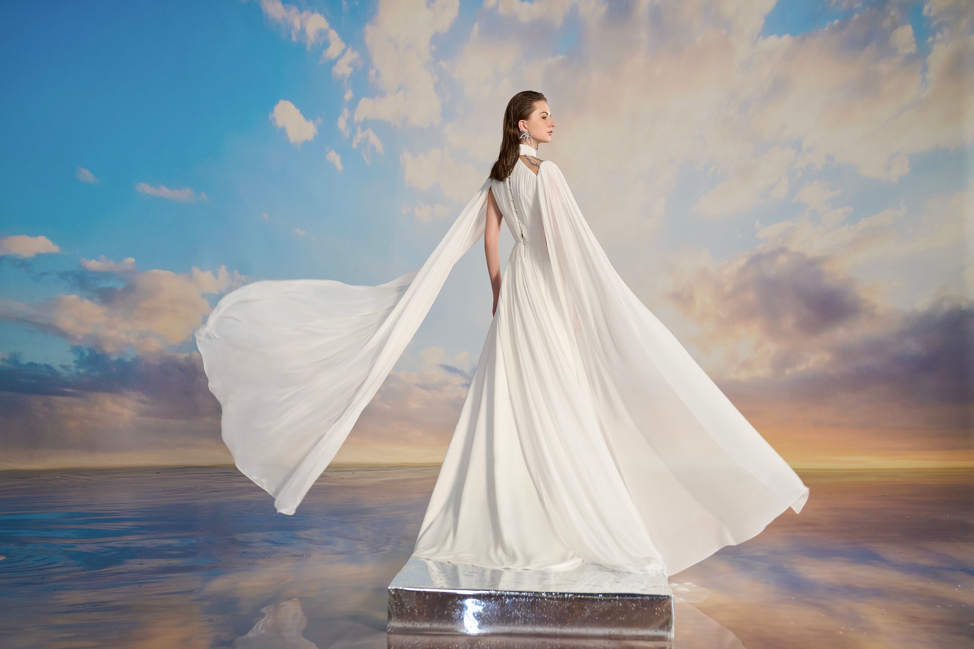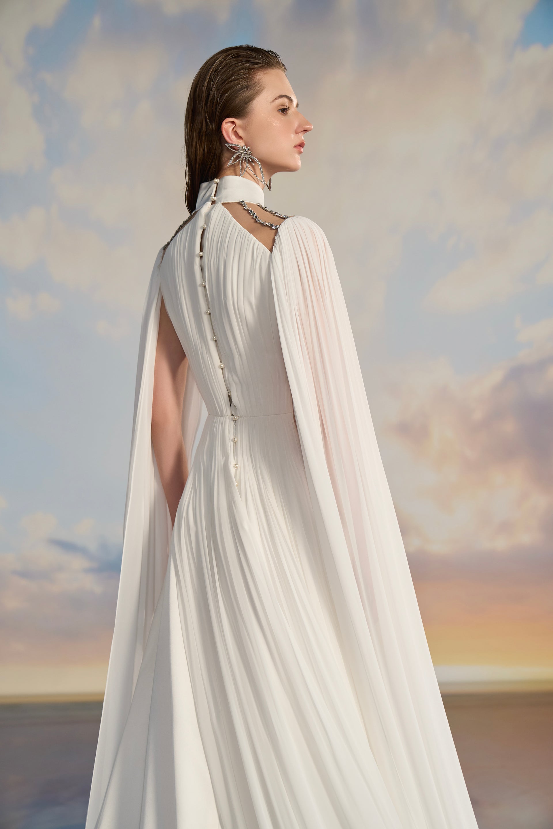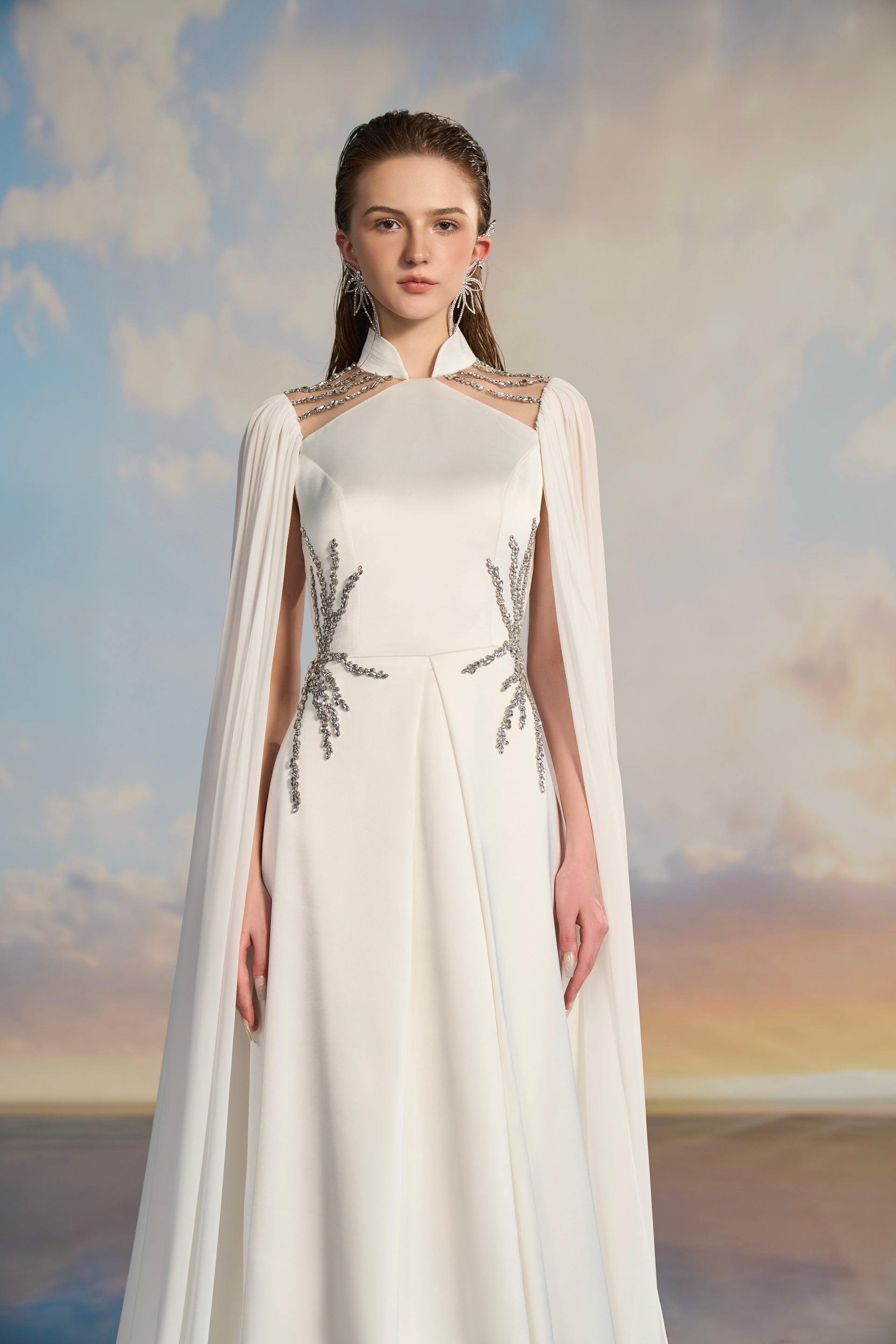 The gown is accentuated by sheer chiffon cape sleeves that flow elegantly from the shoulders, creating a soft, ethereal silhouette. Intricate crystal embellishments adorn the shoulders and waist, adding a touch of brilliance and emphasizing the feminine form.