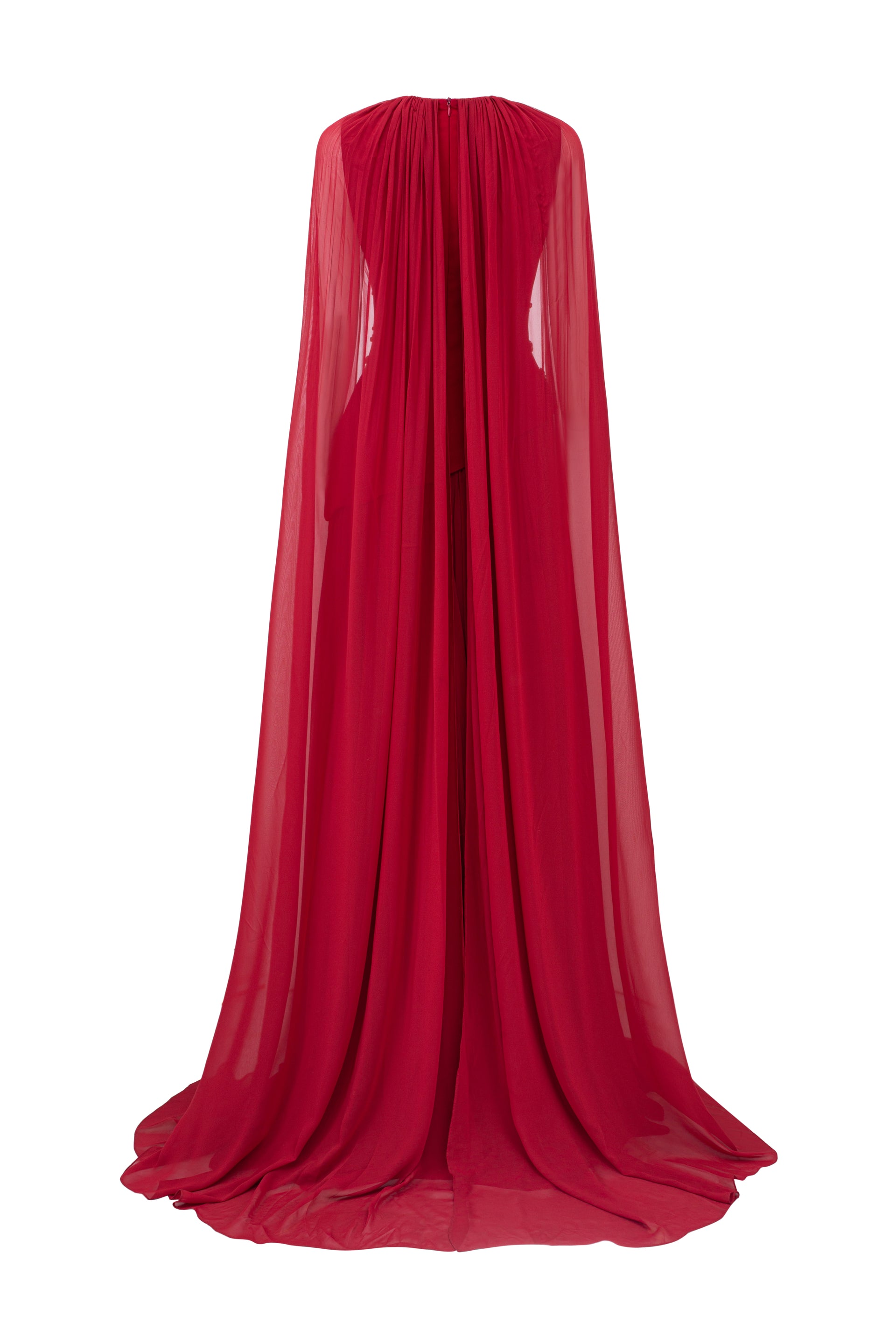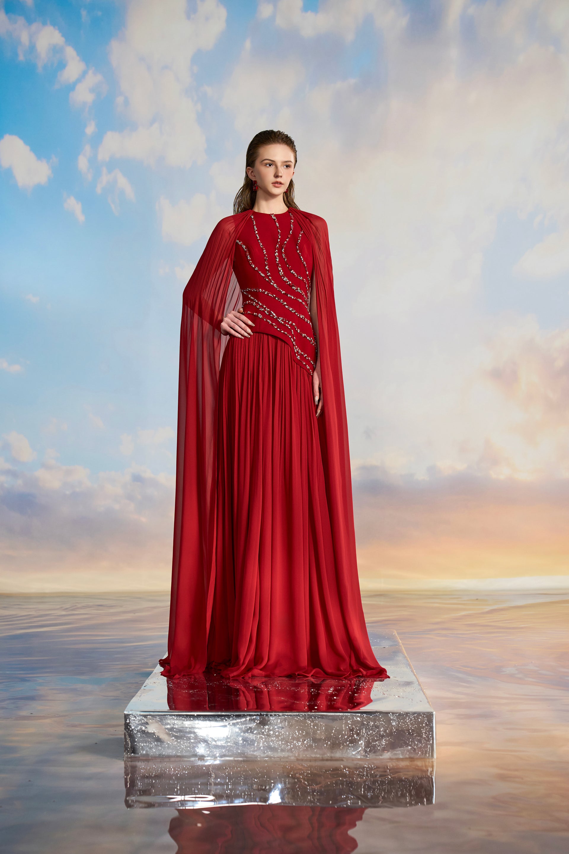 The design features a fitted bodice and a gently flared pleated skirt. Flowing chiffon cape sleeves add a sense of motion and elevate the wearer’s elegance. Delicate crystal embellishments are meticulously hand-applied, forming abstract streams that flow along the body, evoking a sense of ethereal beauty.