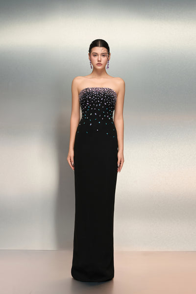 The strapless dress crafted from premium crepe fabric, offering a luxurious and captivating look.