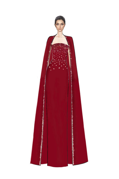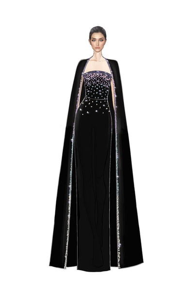 The ensemble features a strapless dress and a matching cape, both crafted from premium crepe fabric, offering a luxurious and captivating look.
