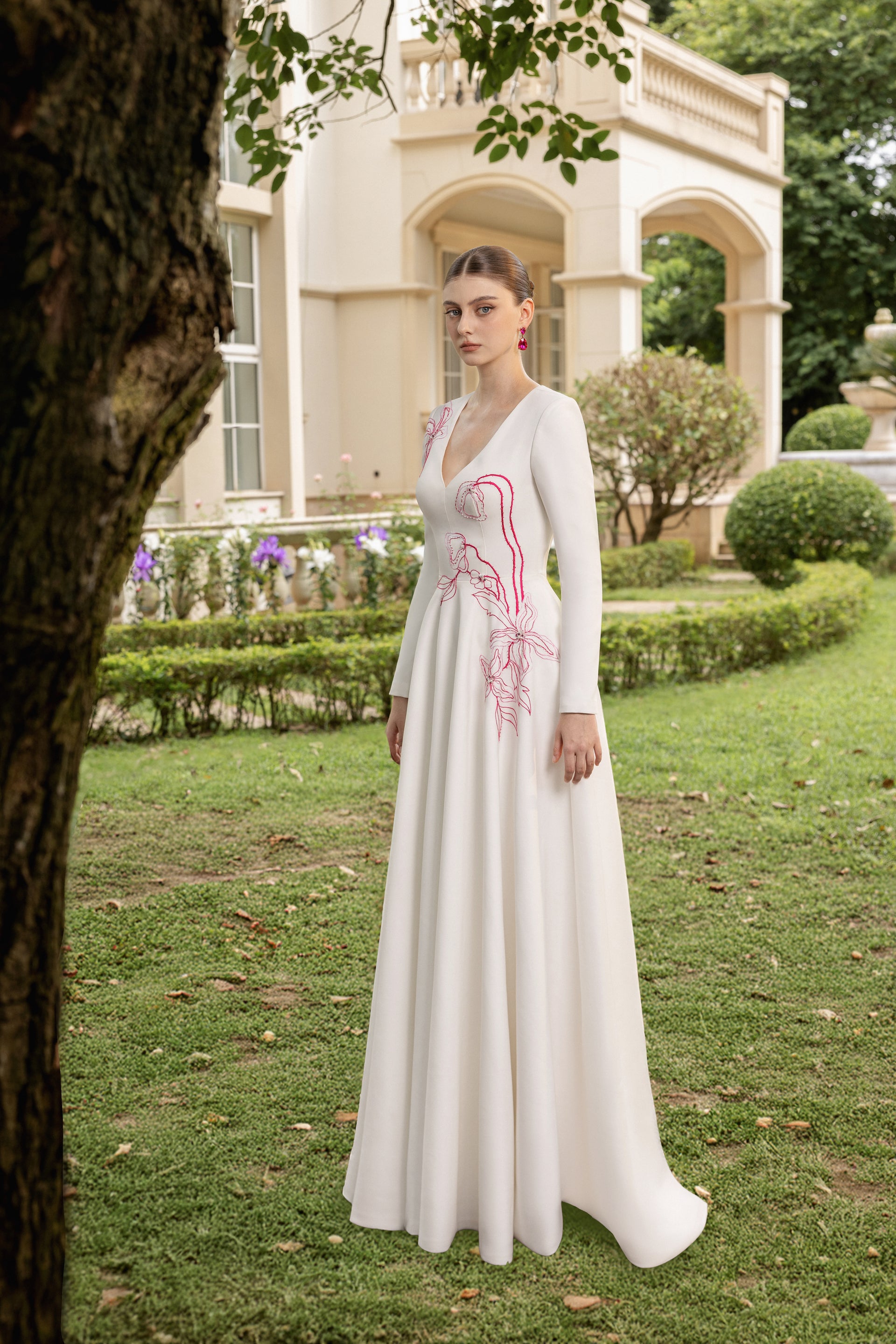 The true artistry lies in the asymmetrical embellishment—intricate chain-stitch embroidery meticulously crafted by hand. This unconventional detailing creates a striking visual contrast, elevating the gown from timeless to truly extraordinary. A perfect choice for those who appreciate understated luxury with a modern, artisanal touch.