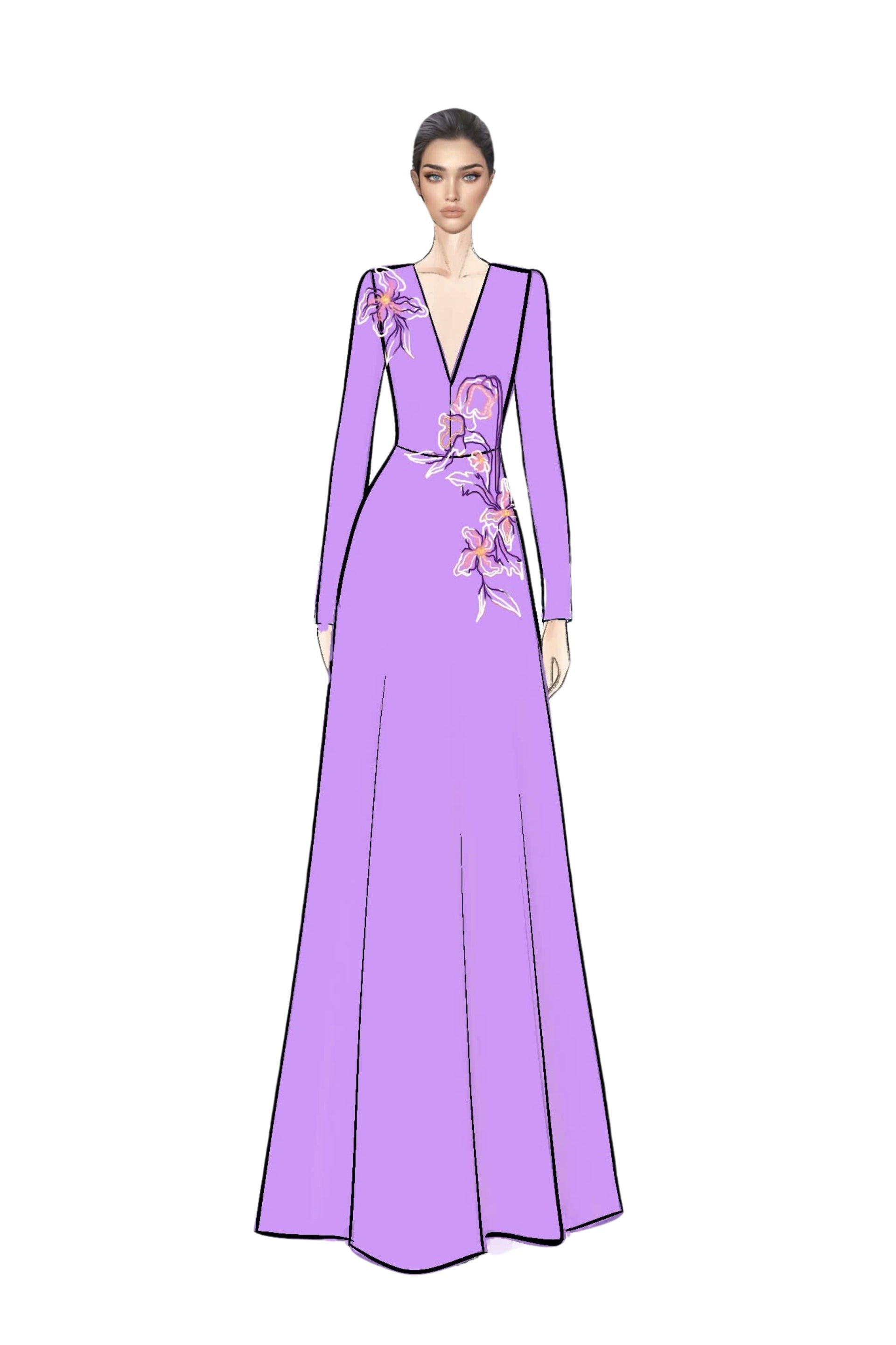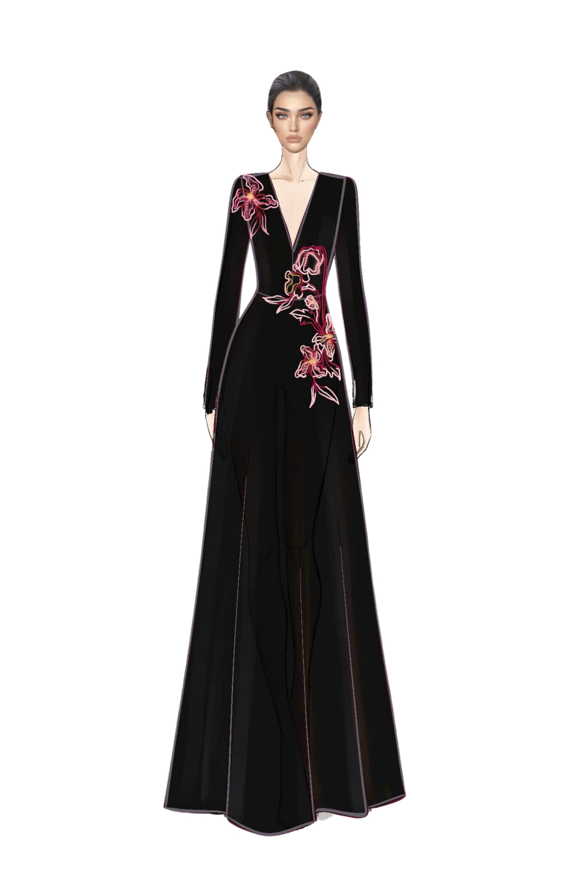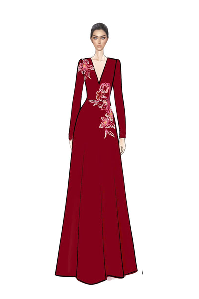 This V-neck gown exudes classic silhouette with a fluid, floor-touch . Crafted from sumptuous crepe, the fabric gracefully drapes, enhanced by natural pleating for a soft, flowing effect. Long sleeves add a touch of refinement, balancing elegance with ease.