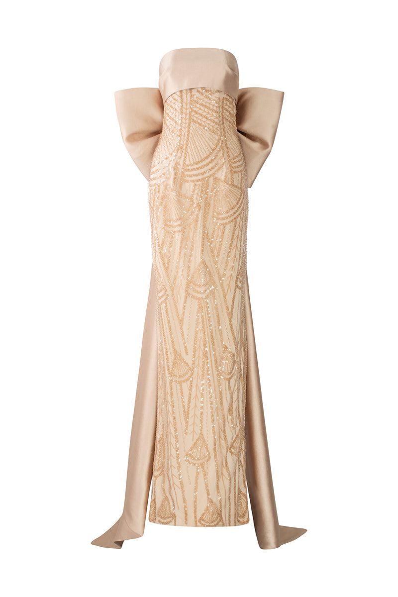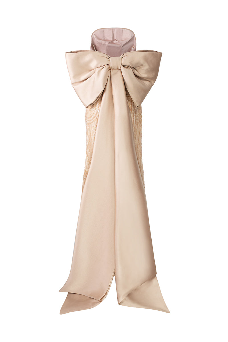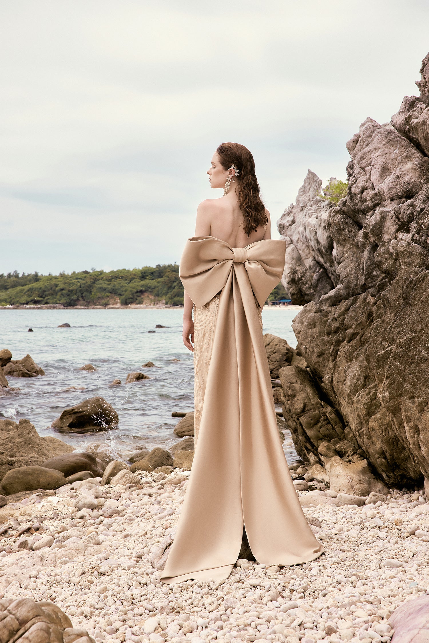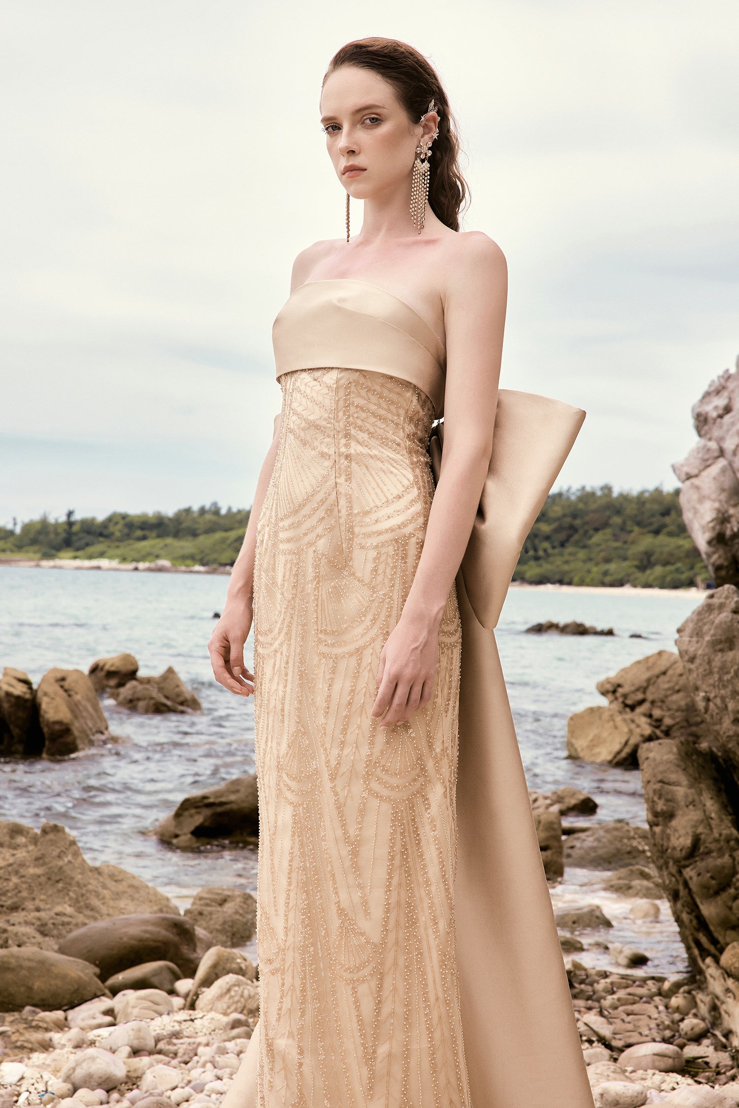 Crystal lace evening dress with chest cup, attached big bow at the back brings a luxurious, charming beauty to the wearer. Design suitable for attending parties and important events