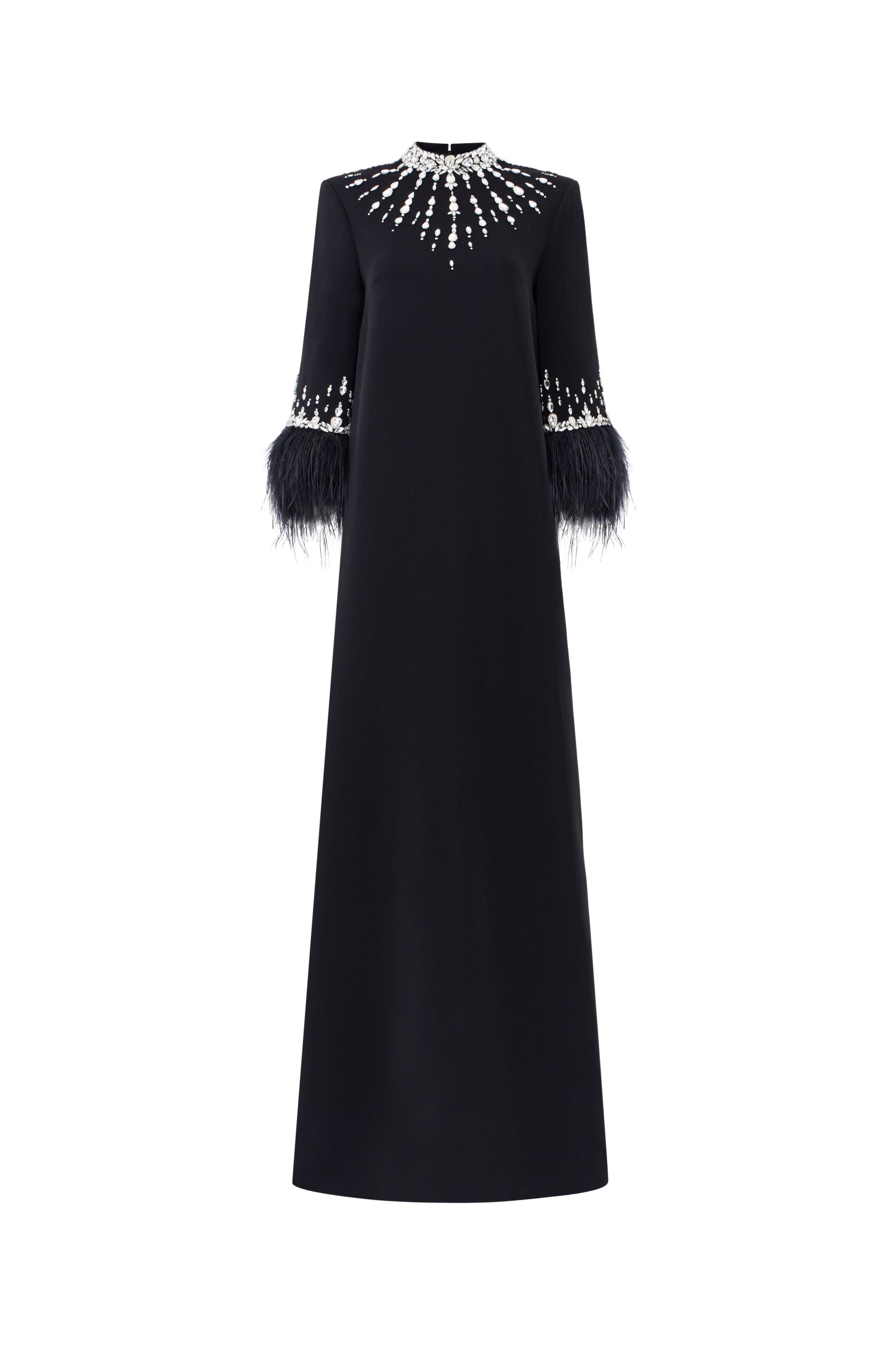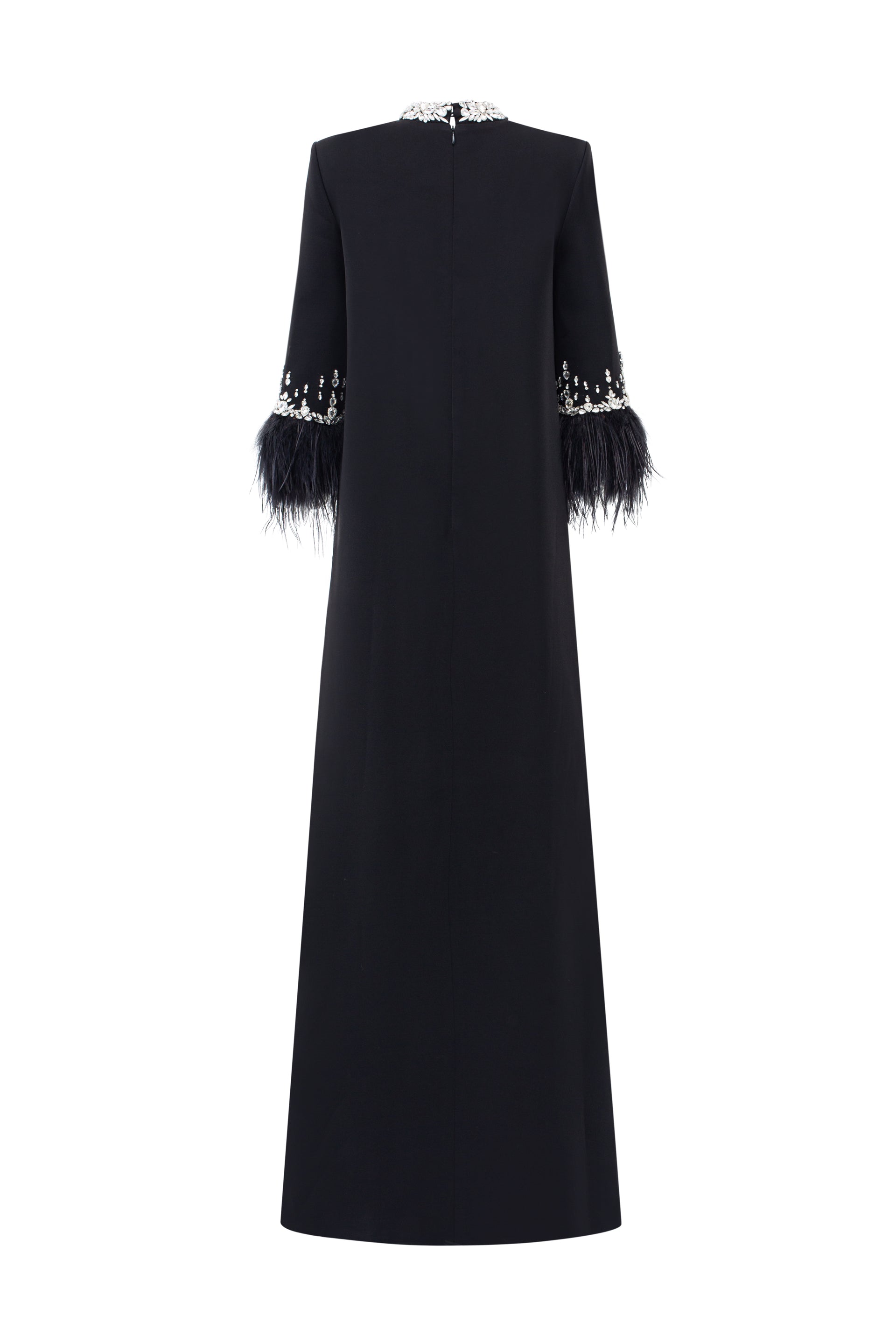 Hand-embellished crystal details radiate from the neckline and cuffs, evoking a celestial sparkle. Soft feathers trim the sleeves, adding couture texture and drama.