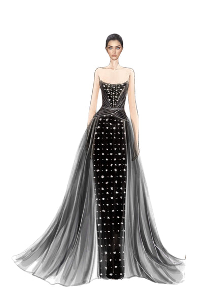 The gown is elevated by intricate hand-pleating along the waist and hips, accentuating the contours of the body. Exquisite embellishments of pearls and crystals are meticulously hand-applied, adding a luminous, sculptural effect to this stunning couture creation. A perfect balance of bold design and timeless elegance.