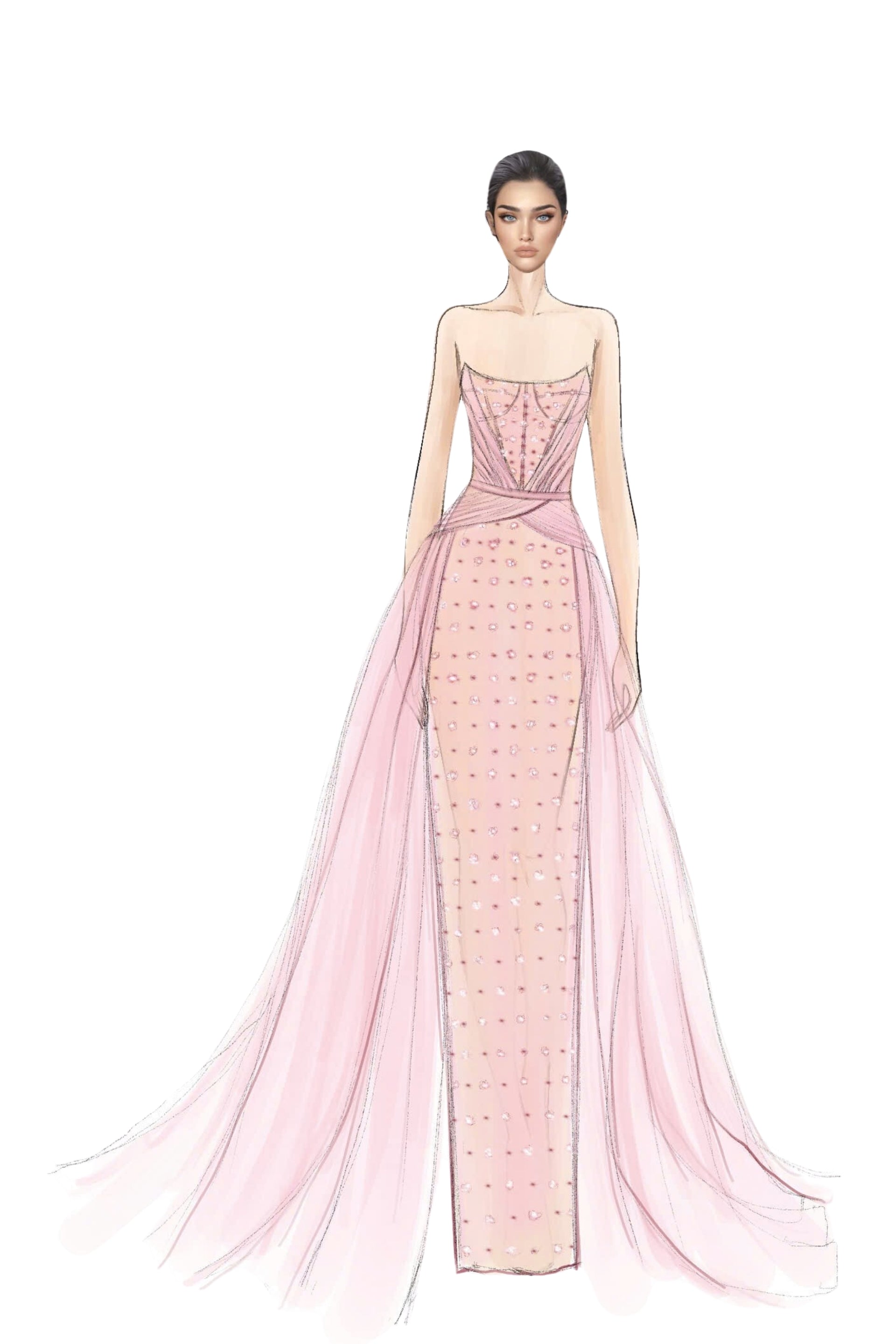 A striking strapless gown with a sculpted cup chest uniquely designed in a cat-ear shape for an avant-garde yet elegant appeal.