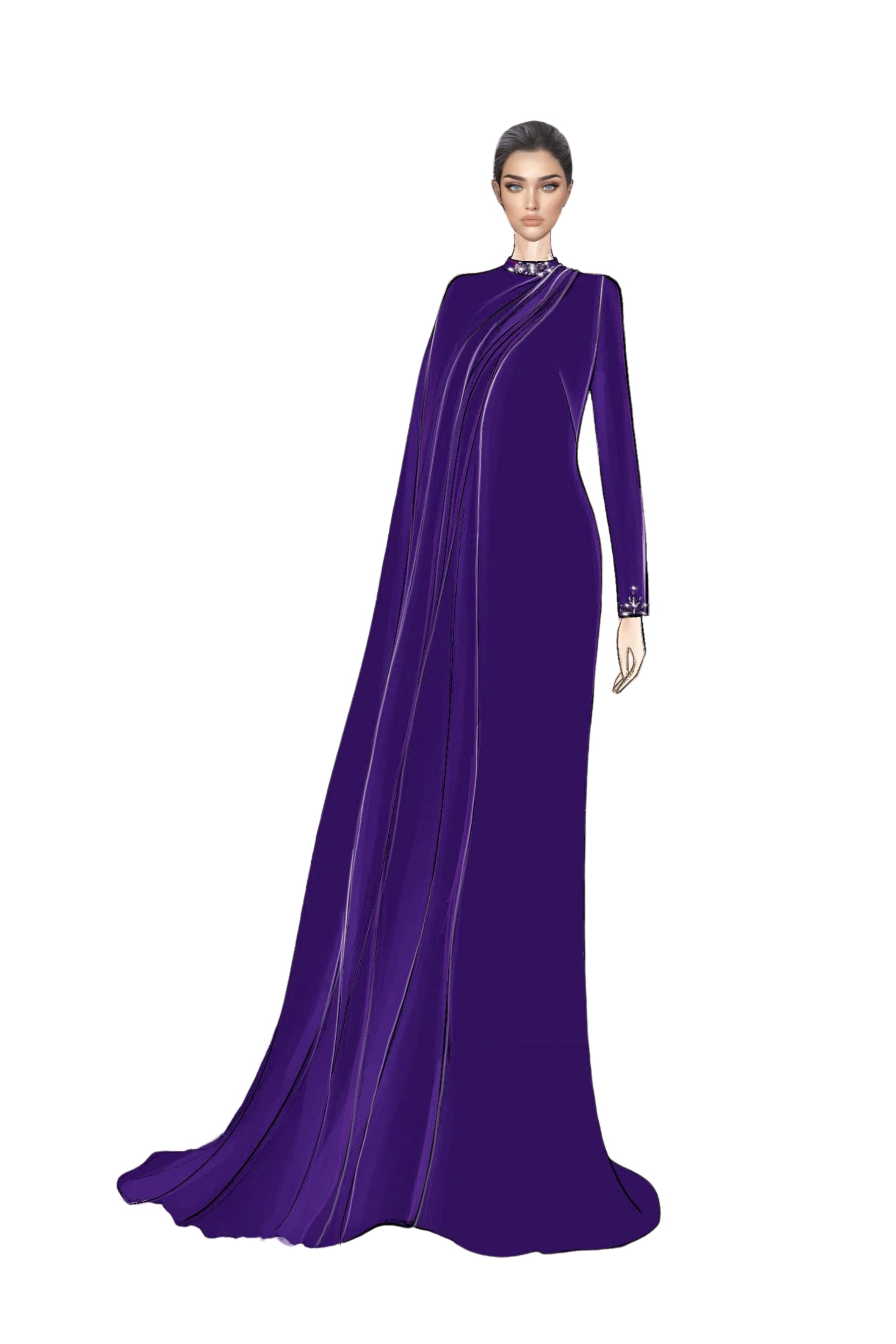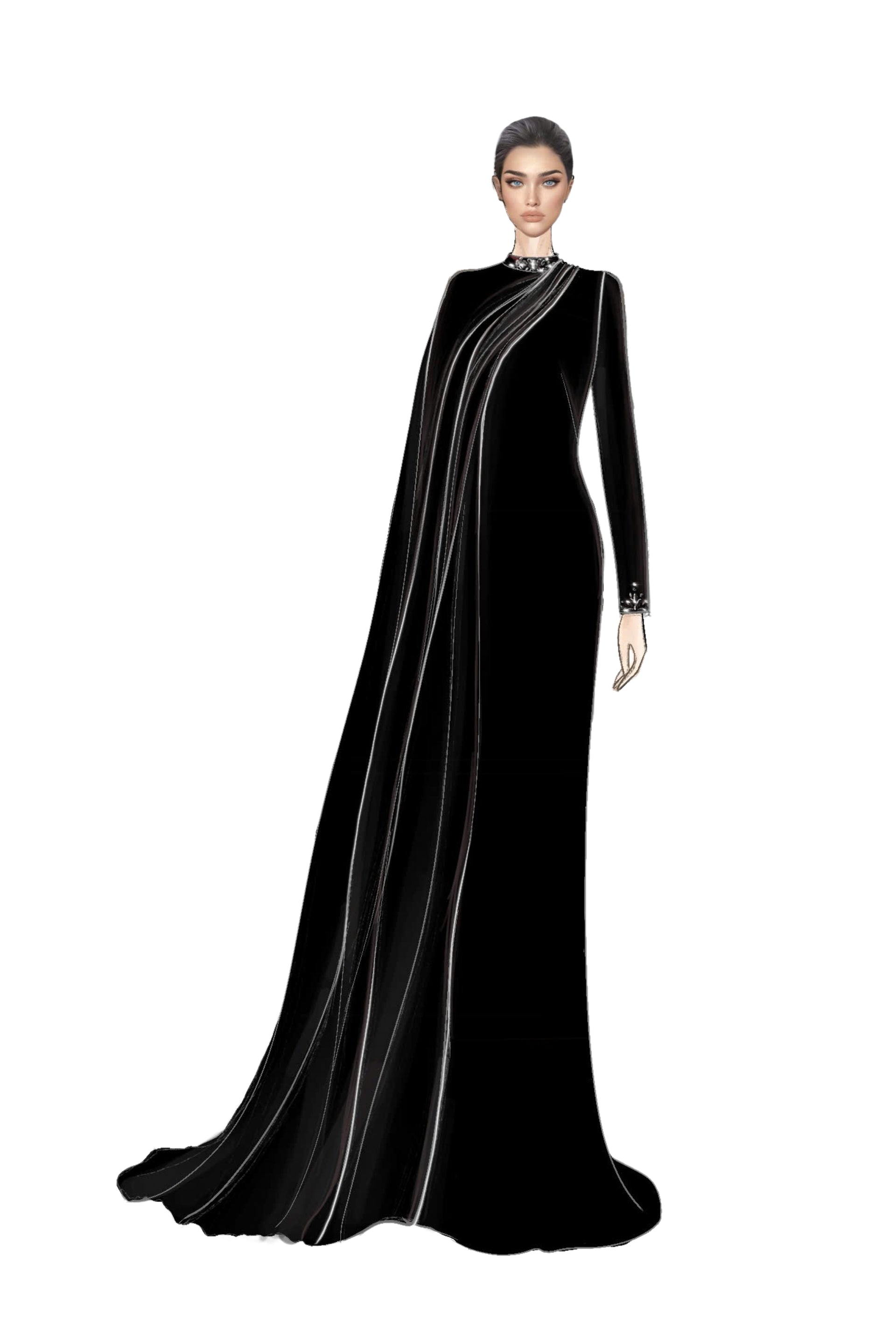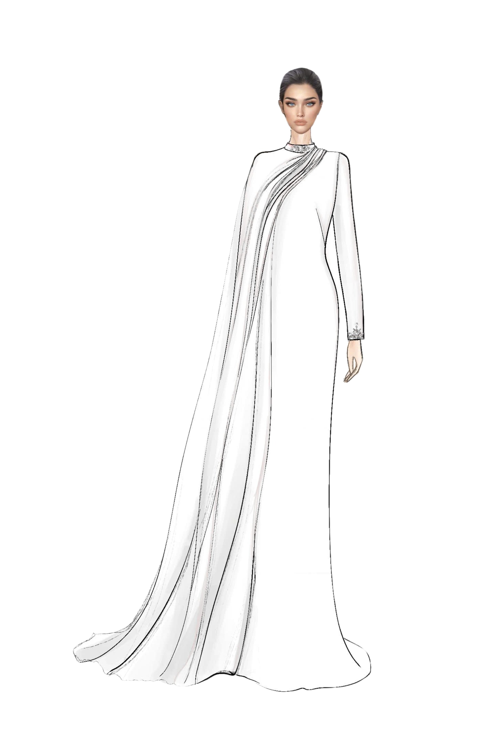 Adding to its grandeur is a dramatic, draped cape flowing seamlessly from the shoulders, adds a sense of movement and layers of sophistication, balancing the gown’s structured silhouette with a soft, flowing element.
