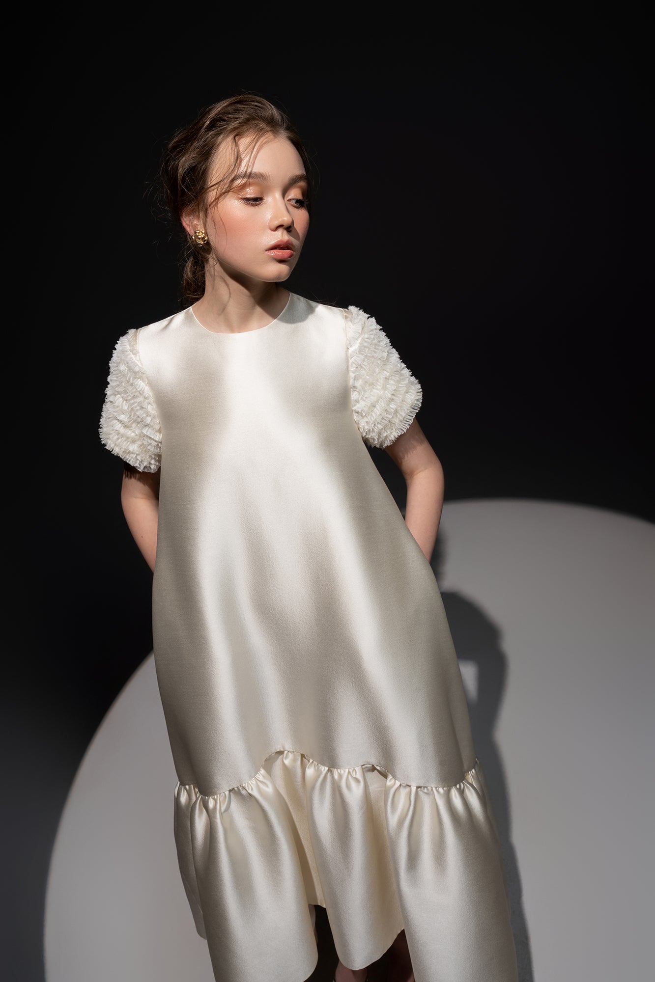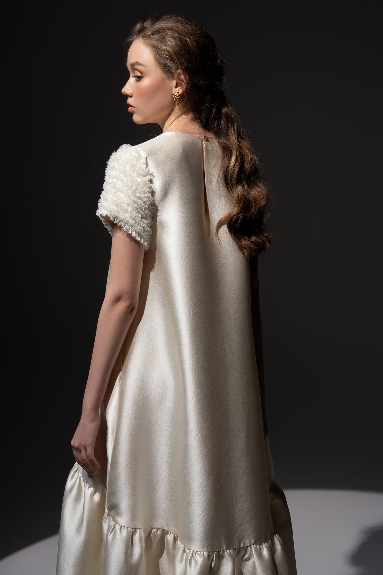 * Description: Mullet taffeta dress with ruffle sleeves