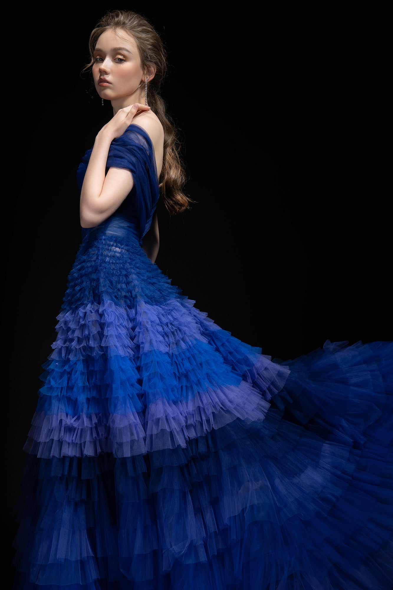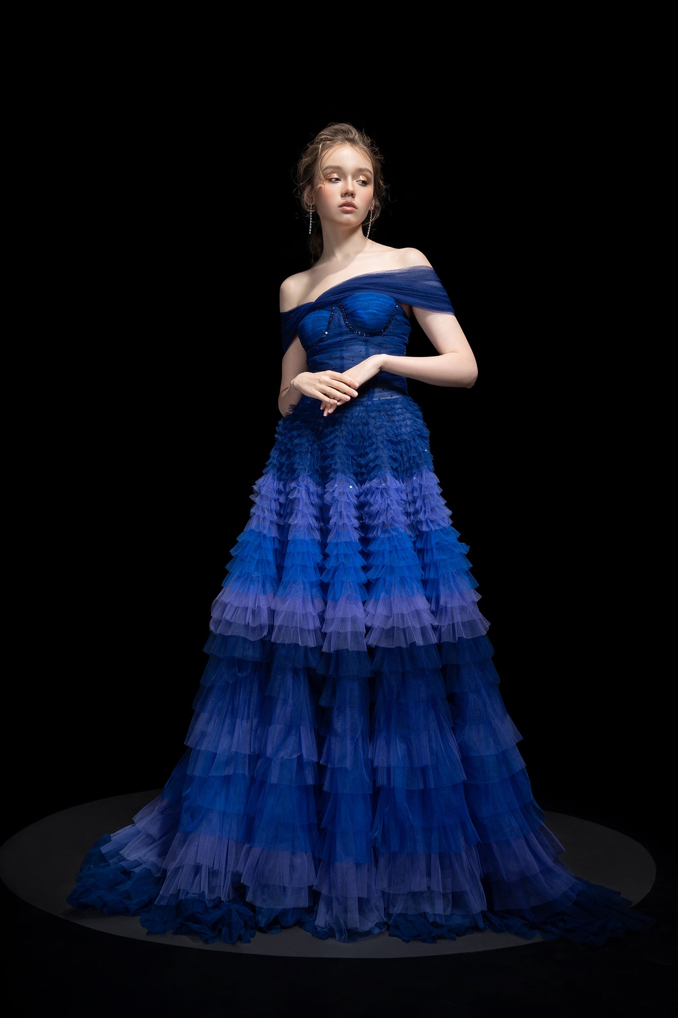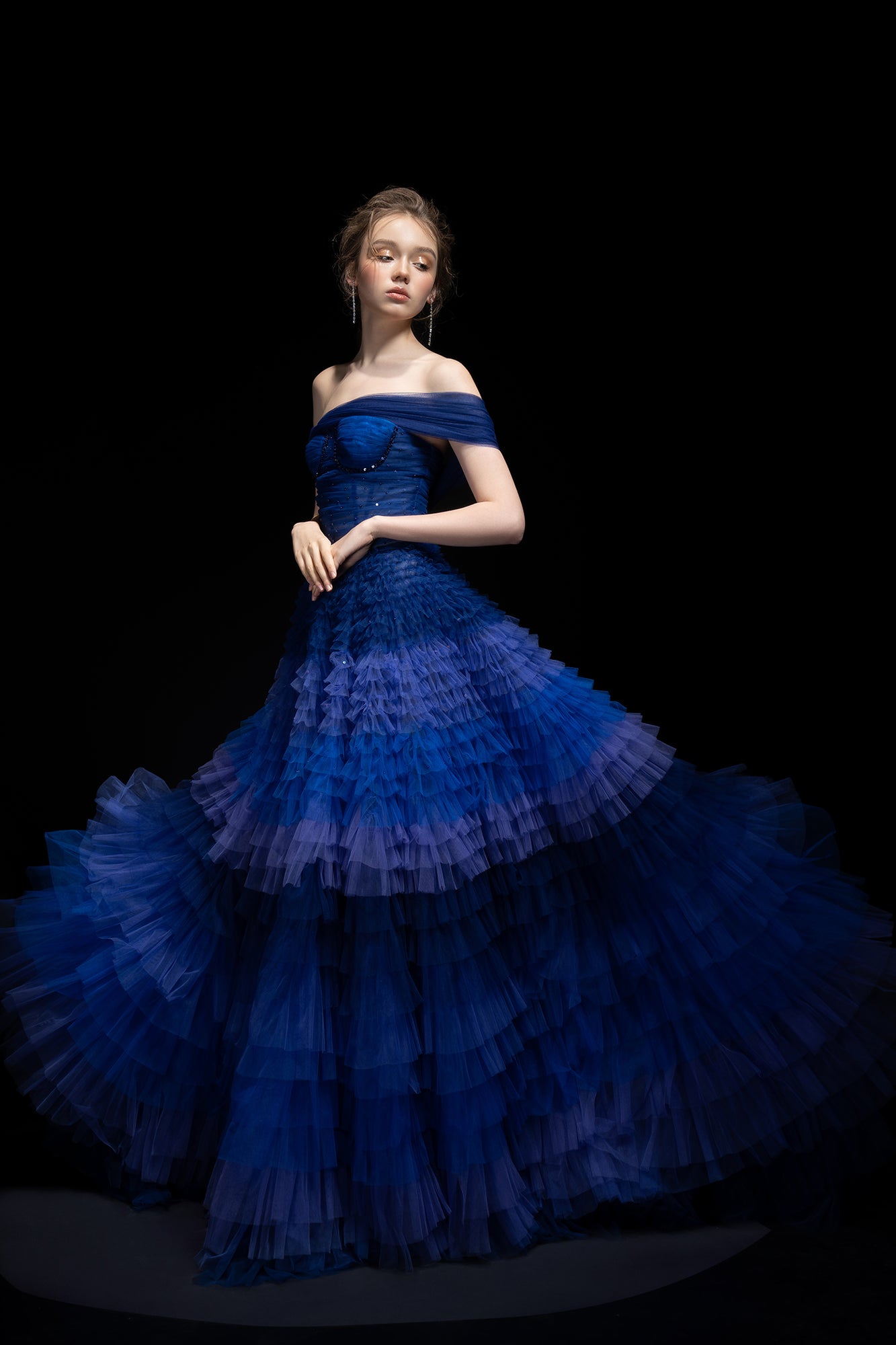 * Detail: Inspired by proms, the dress appears romantic and softly with tulle strap and a floating layered ruffle skirt. The background color is coordinated delicately to create a sense of a night sky at the sea, shimmering and mysterious.