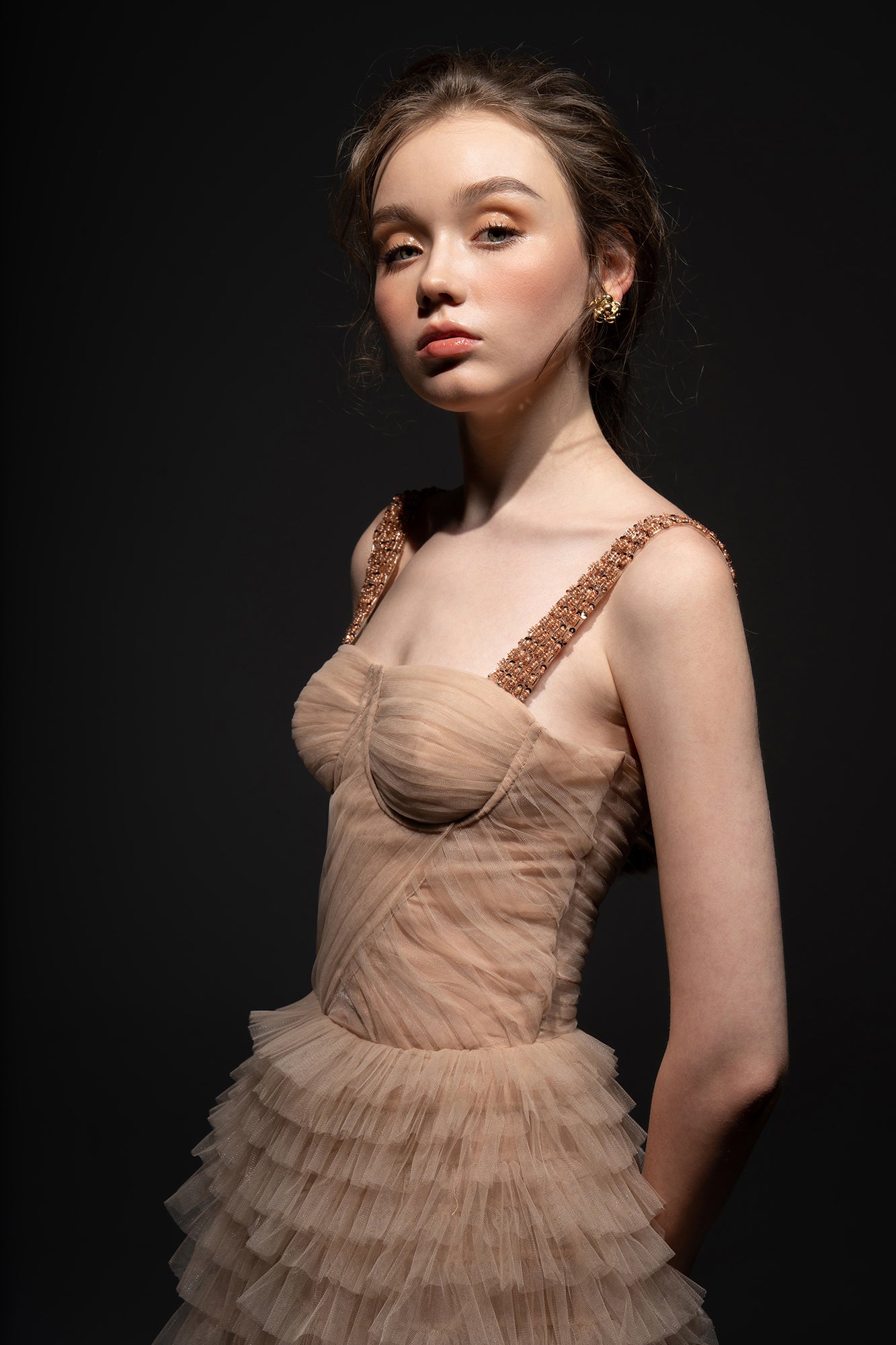 * Description: Tulle evening dress with layered ruffle chest cup