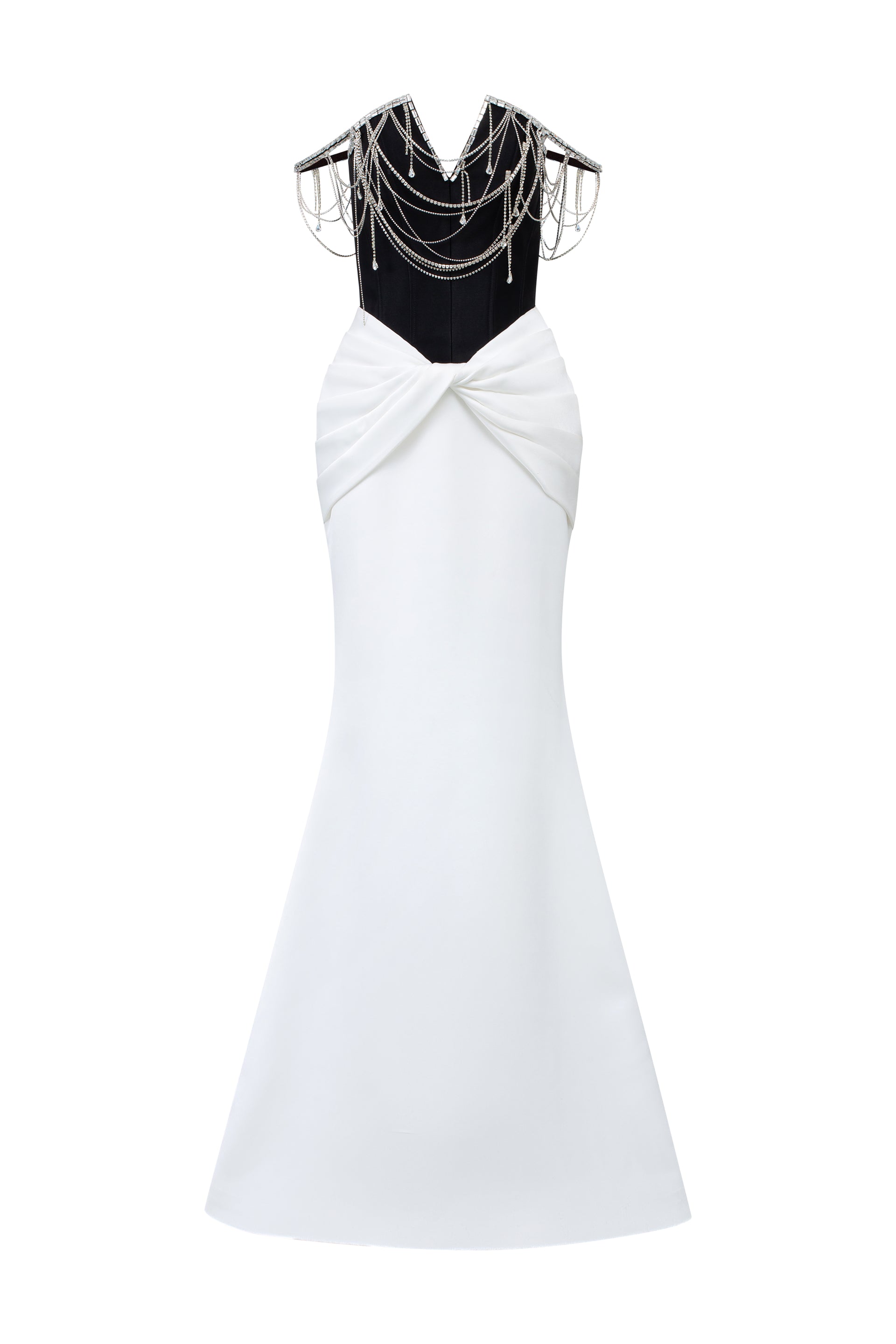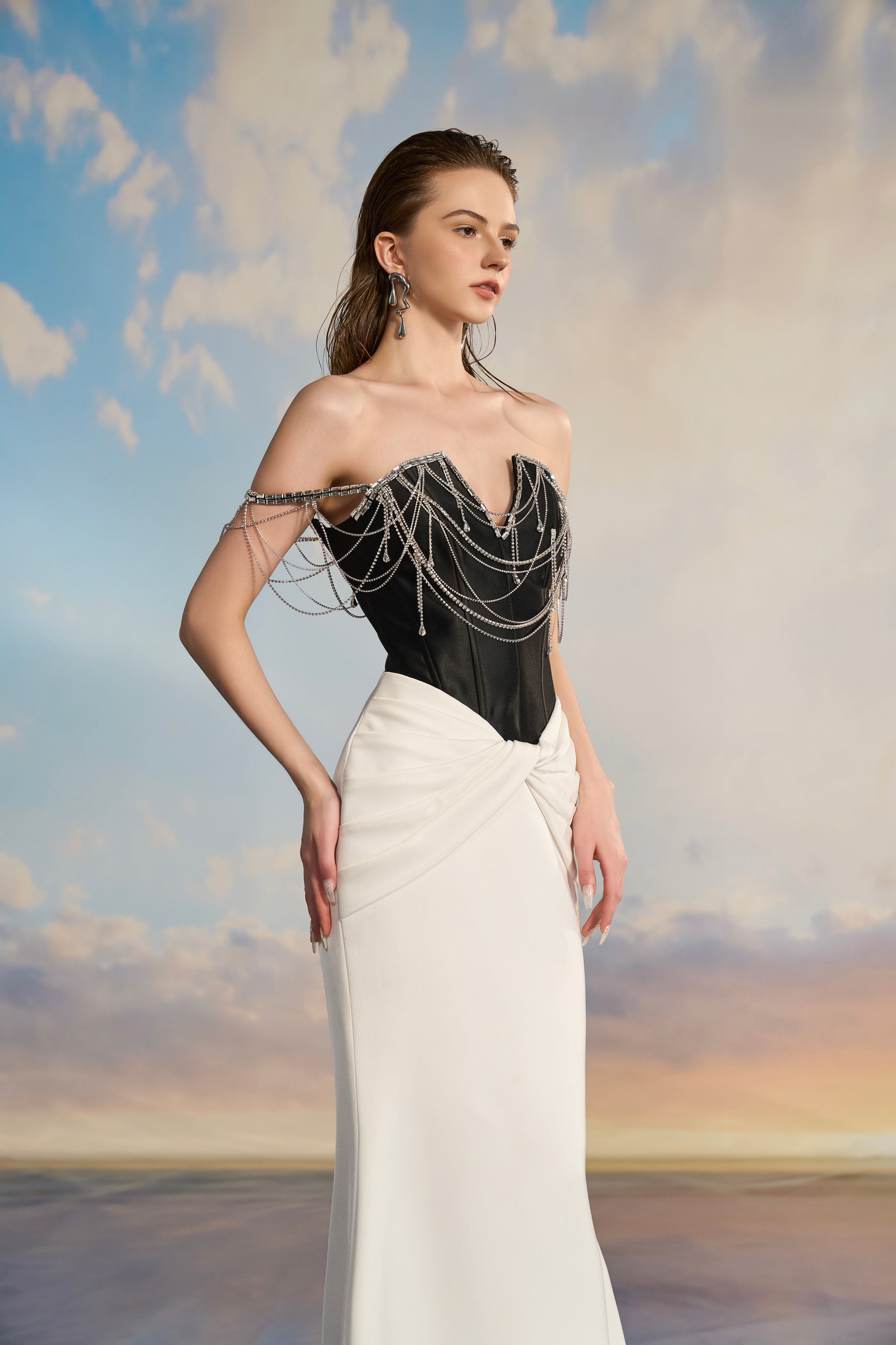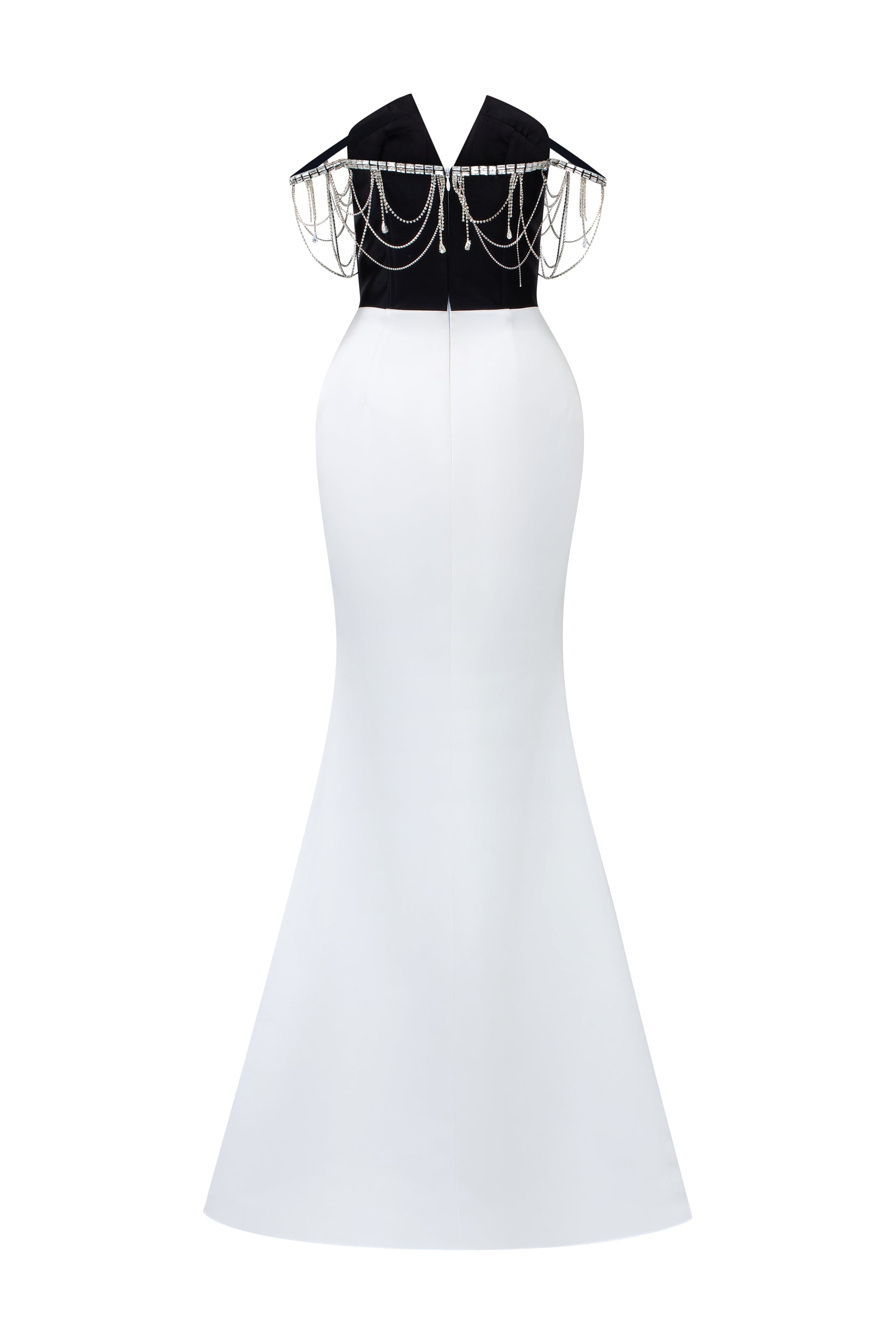 The silhouette hugs the curves before flaring at the hem, while the upper body is adorned with cascading handmade crystal chain embellishments, elegantly draping over the shoulders and arms like fine jewelry.