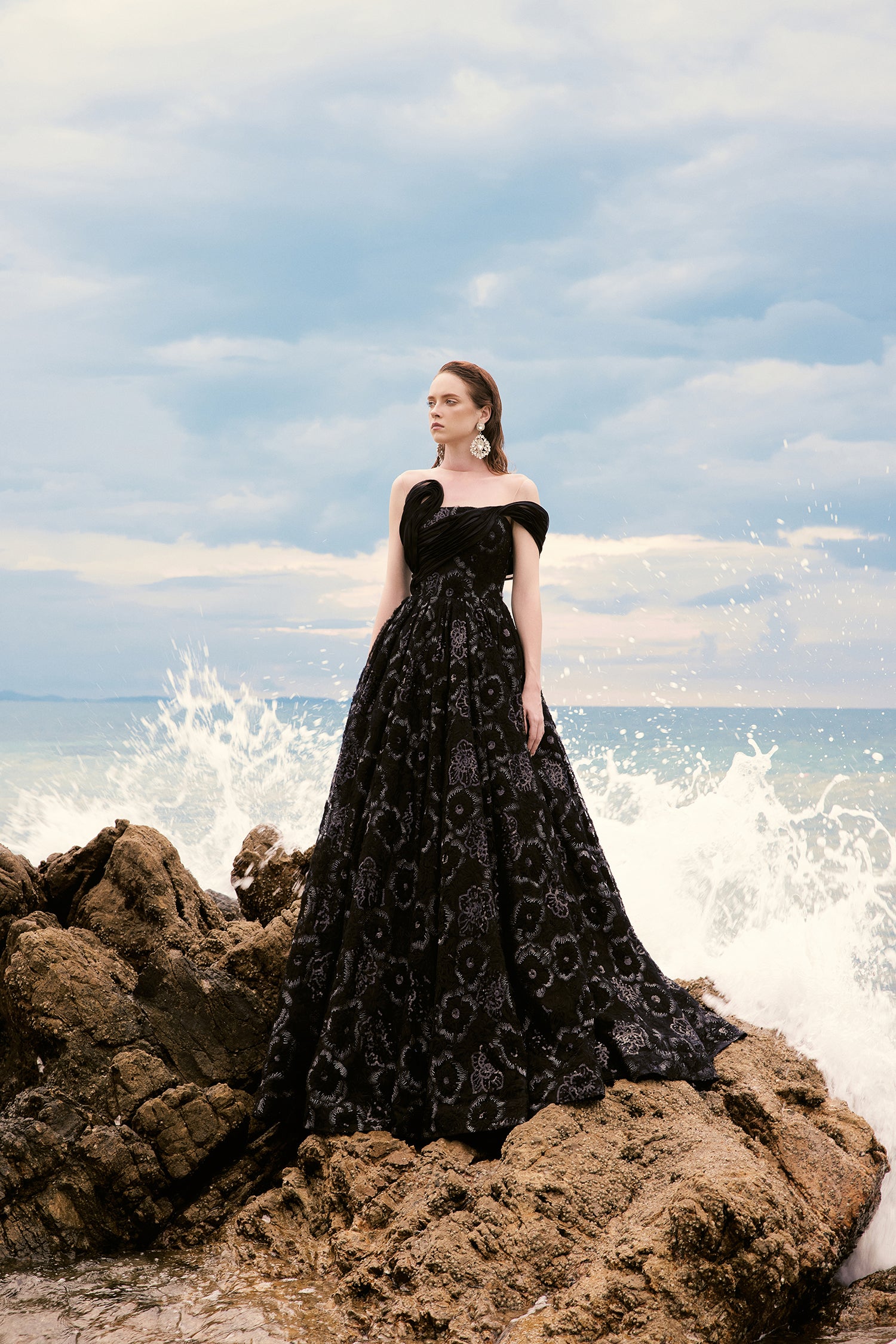 Floral tulle lace evening dress with off-the-shoulder and shiny silk create 3D shape on one side brings a luxurious, charming beauty to the wearer. Design suitable for attending parties and important events