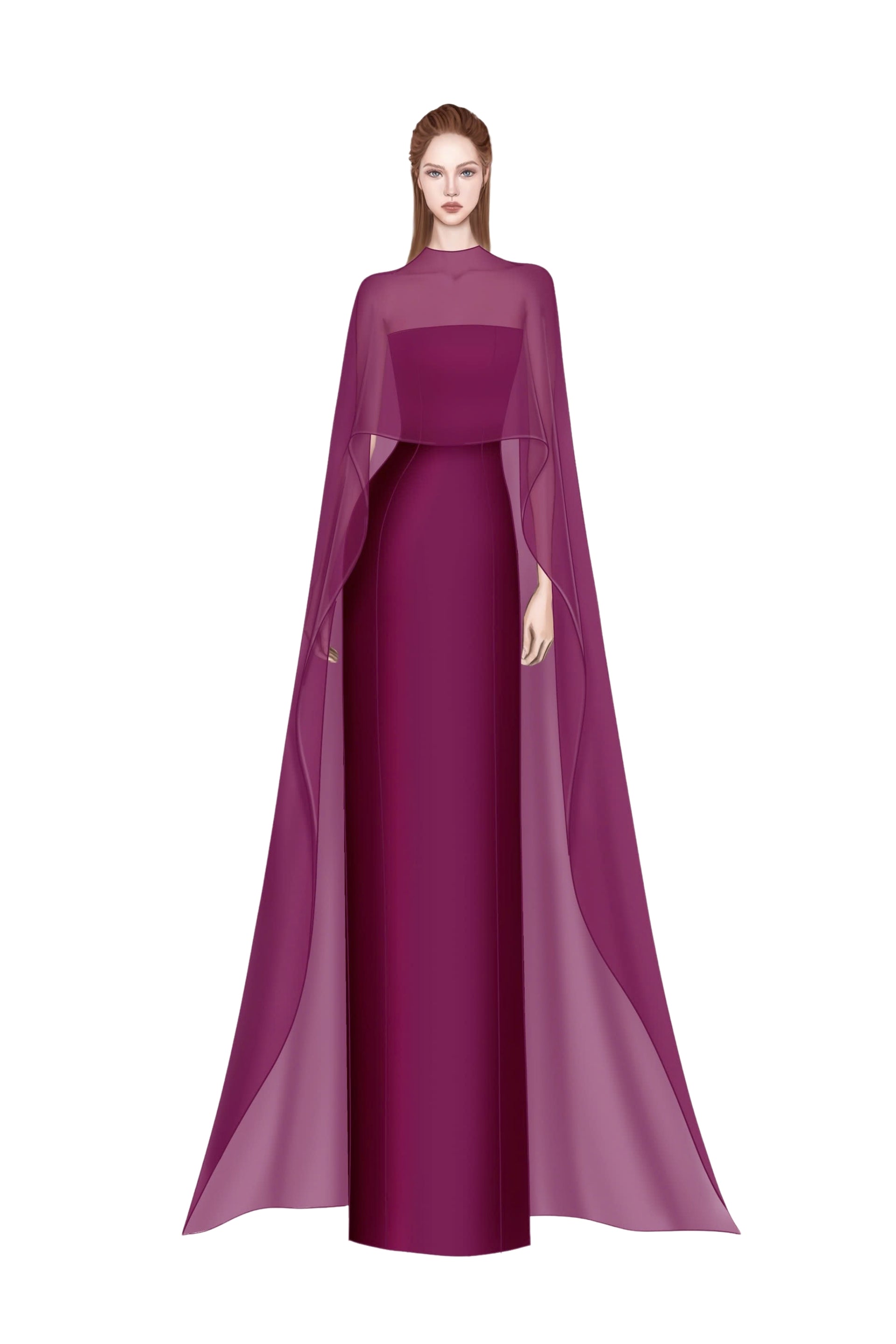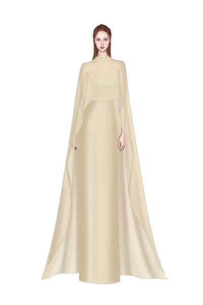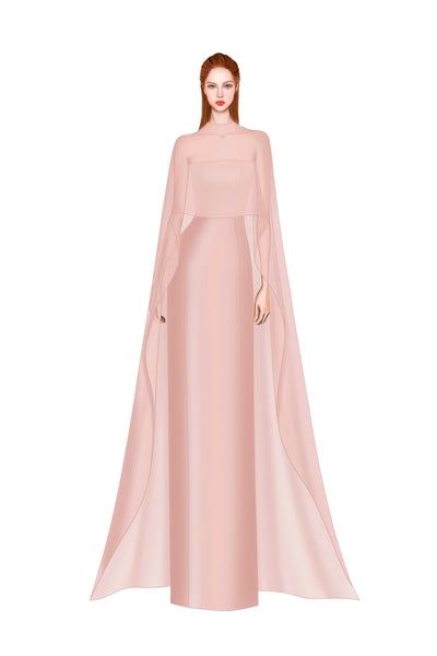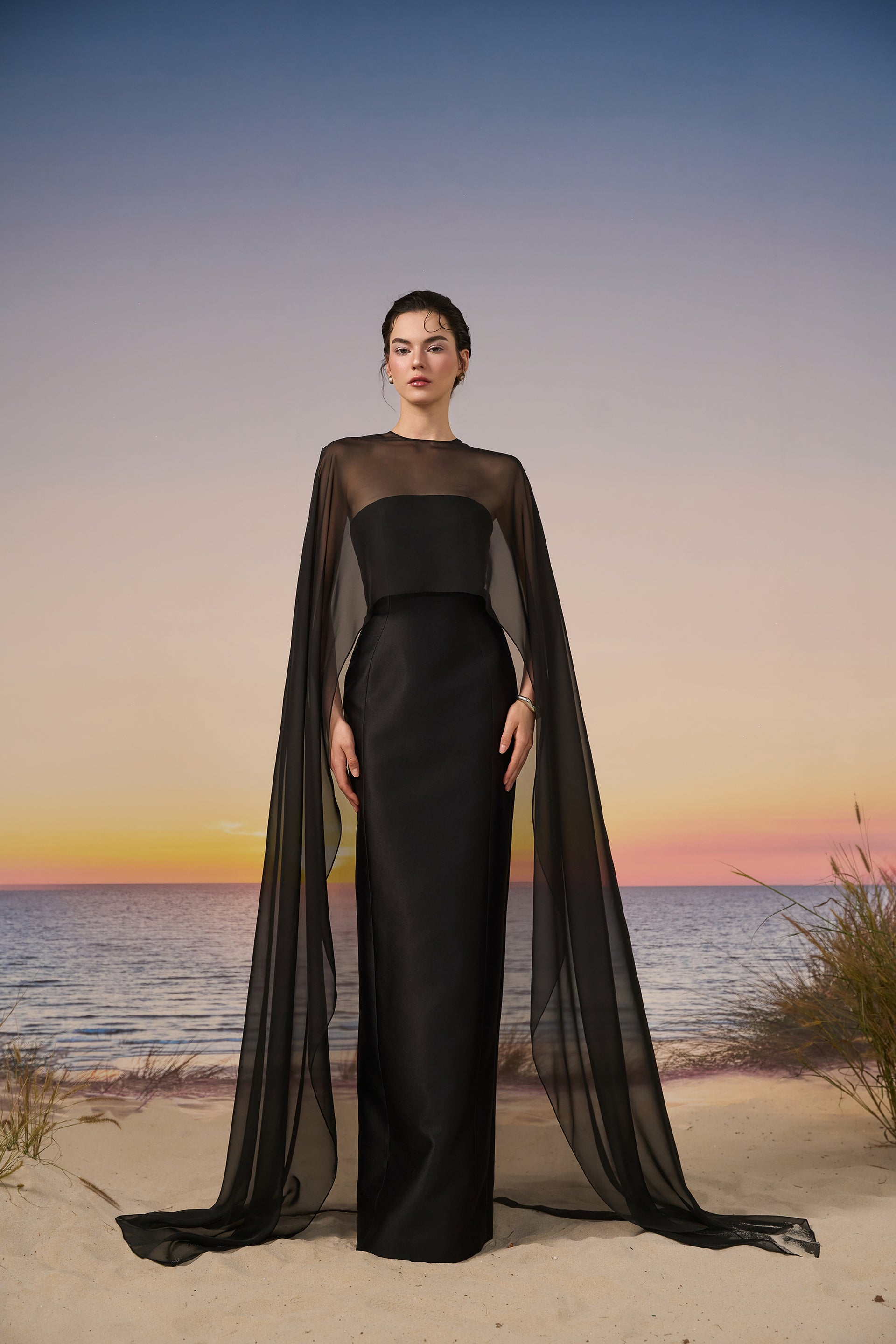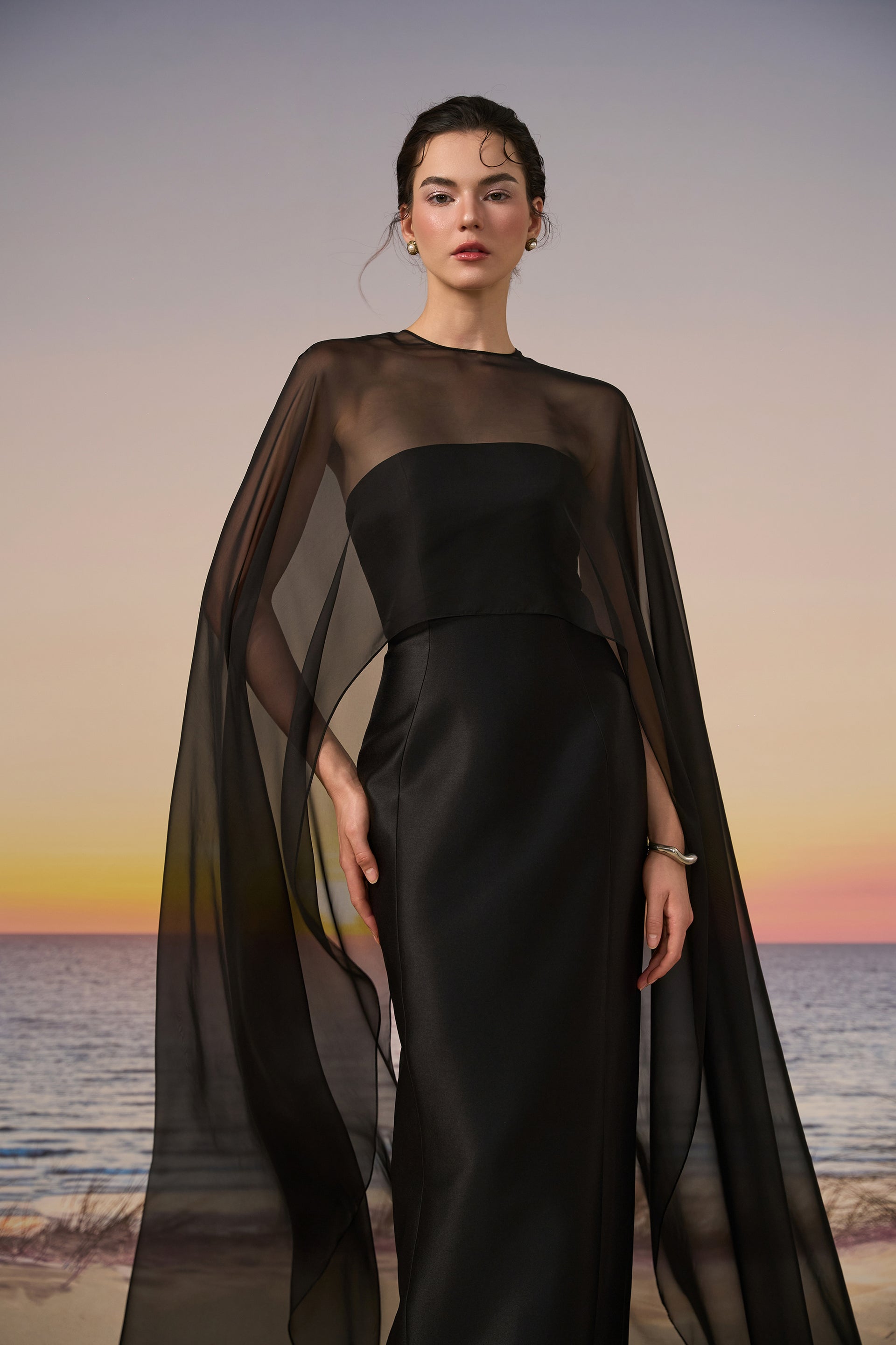The fitted taffeta base holds its shape beautifully, flattering the body’s curves. Over it, a long, flowing sheer cape drapes from the shoulders, adding a sense of movement and refined drama as you walk.