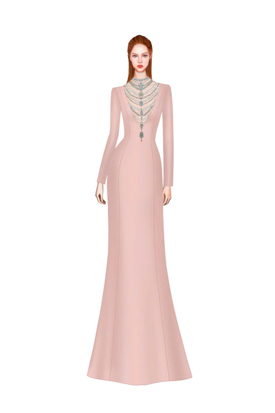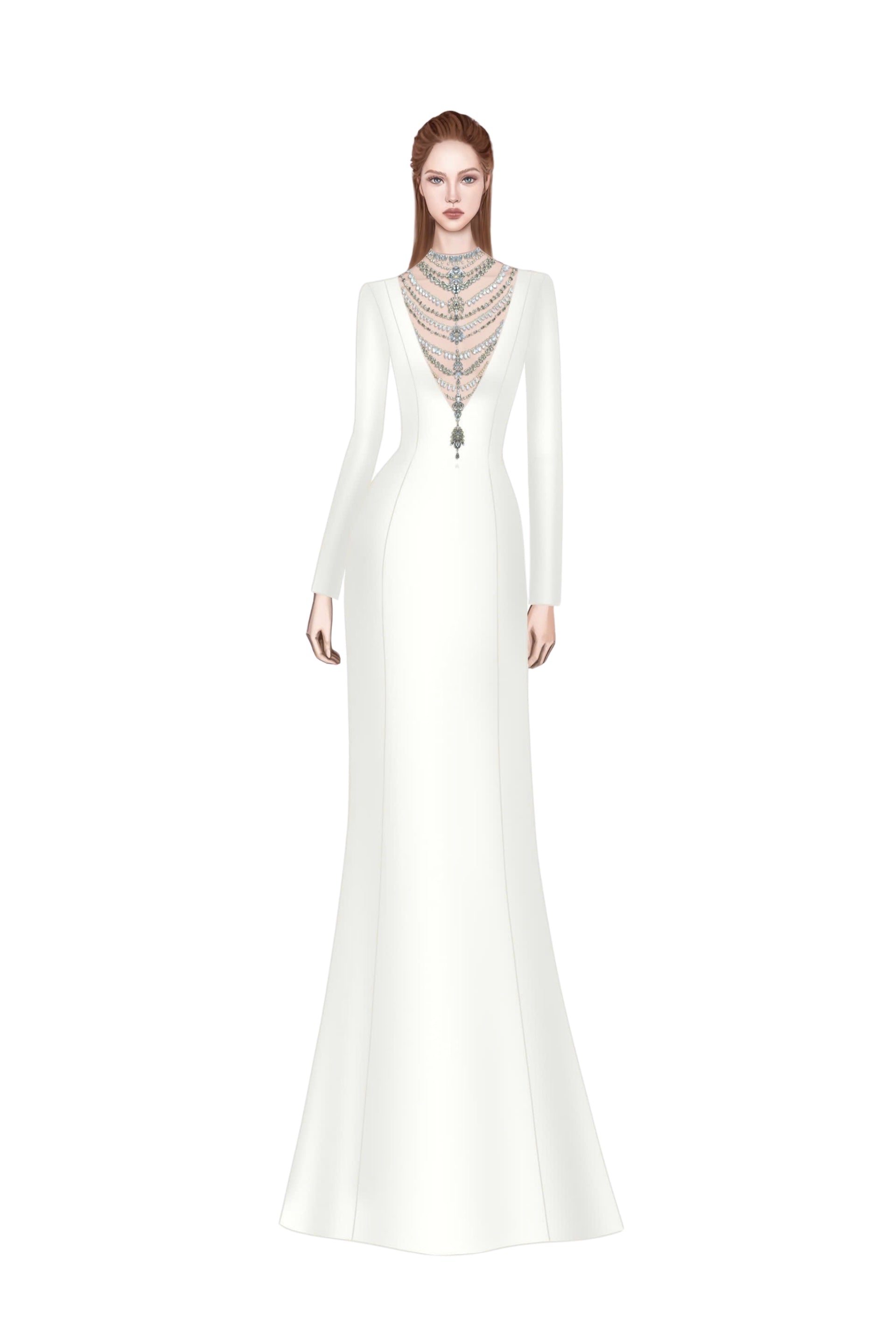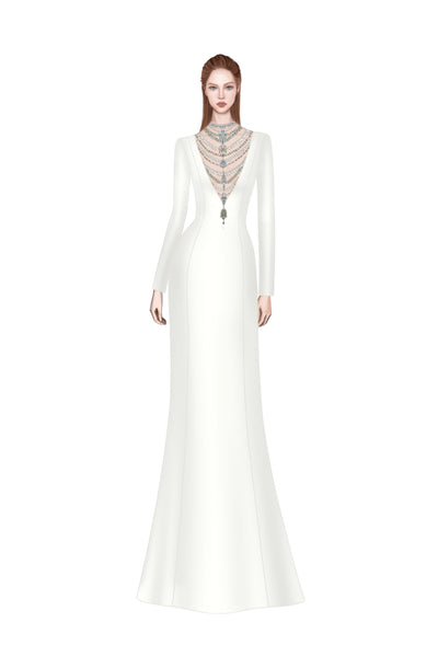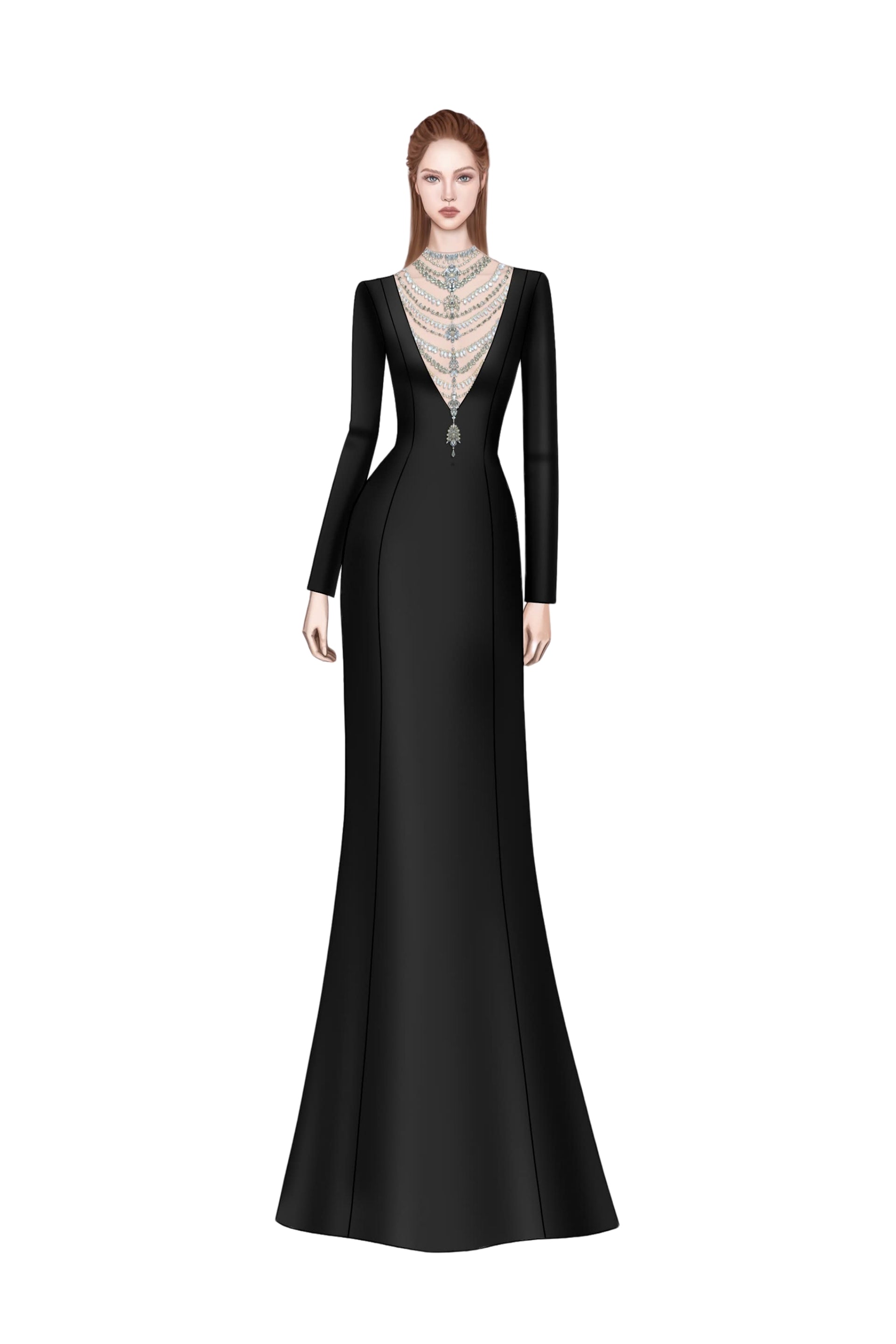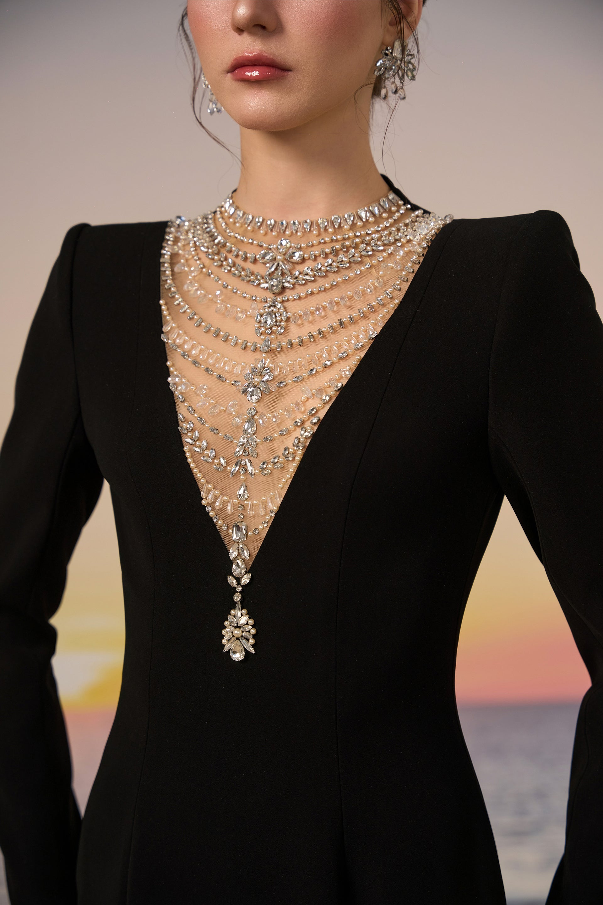 The fitted long-sleeve design with a deep V neckline accentuates the wearer’s curves and neckline. A standout feature is the illusion mesh panel at the chest, adorned with hand-applied crystal strands, creating the effect of a built-in statement necklace.