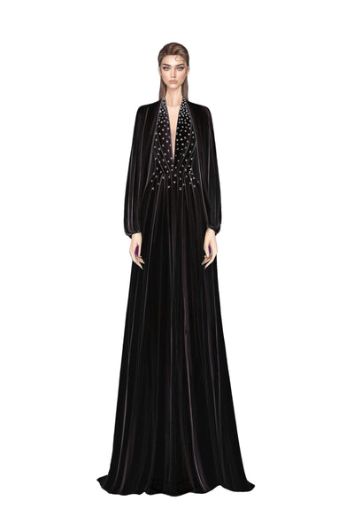 The floor-length flared skirt is paired with a deep V-neckline adorned with intricate crystal embellishments, creating a striking and elegant focal point. Long puff sleeves add a touch of classic softness and sophistication.