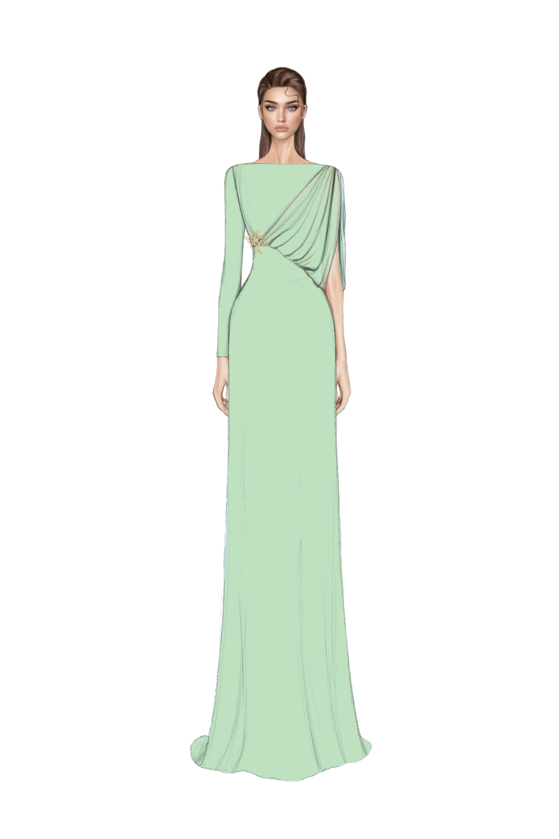 This evening gown combines luxurious crepe with soft chiffon, offering an elegant silhouette and graceful movement.