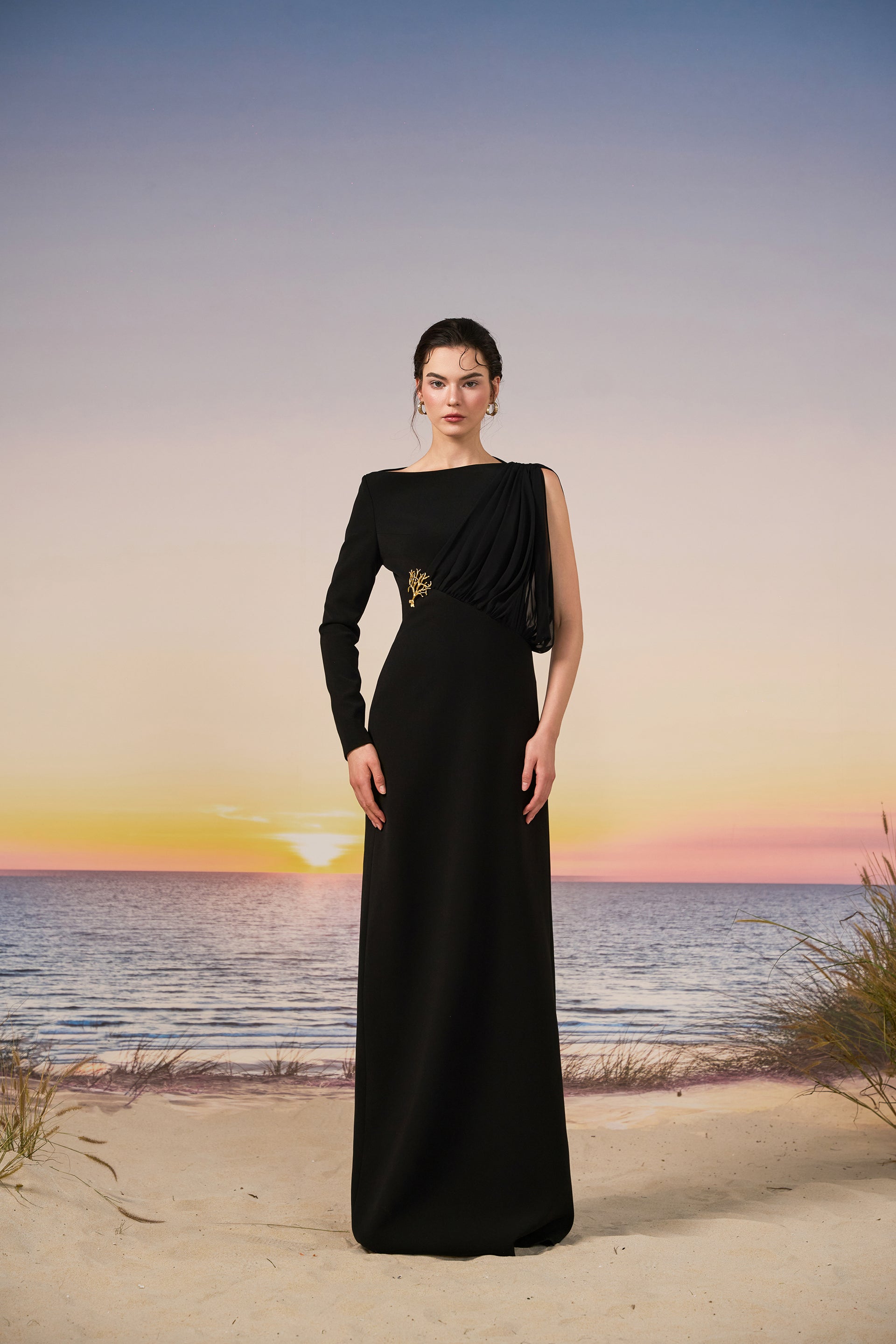 The asymmetrical design features one long sleeve and one bare shoulder, adding a modern, eye-catching twist. Pleated chiffon drapes across the shoulder and waist, accented with a metallic embellishment that highlights the waist and creates striking visual appeal. With its refined shape and flowing details, this gown is an ideal choice for evening galas, red carpet events, or formal occasions. Composition: Dress: 95% Crepe, 5% Chiffon; Lining: 100% polyester Dress length: 160 cm (from shoulder to floor) Model: Height 174 cm - Bust 82 cm - Waist 63 cm - Hips 94 cm - wearing size XS |
