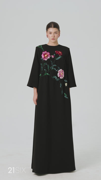 The minimalist design allows the intricate embellishments to take center stage. Large, vibrant flowers in bold colors stand out against the black fabric, creating a striking contrast. The flowers and leaves are hand-crafted from a combination of sequins, crystals, stones, and beads, adding depth and texture to the design. They radiate a colorful, eye-catching sparkle, bringing an artistic and dynamic flair to the piece.